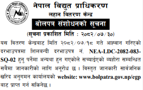 | 228 | NEA, Dhalkebar Grid | Supply and Delivery of 33 kV Cable Head Jointing Kit and HDPE Double Wall Corrugated Pipe at Dhalkebar Grid Division | 14/11/2025 | PPMO | 30/11/2025 | Click Here | |