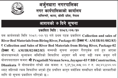 | 236 | Ramdhuni Municipality Office, Sunsari | Jiwan Bigyan Bhawan Nirman, Sahari Swasthaya Kendra Gherabera, Ramjanaki Sabhahall Nirman, Ikrahi Khopkendra ko Sauchalya Nirman | 14/11/2025 | PPMO | 30/11/2025 | Click Here | |