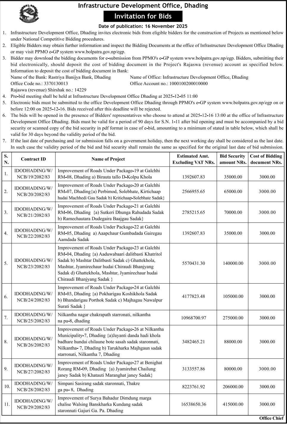 | 16 | IDOSYANGJA | Kalsyangdi, Dahakhola, Kalkhu Ramche Sadak Putalibazar-9 Ra Banethok Bhadrapata Hudai Riyale Sadak Bhirkot-3, Syangja | 14/11/2025 | PPMO | 15/12/2025 | Click Here | |