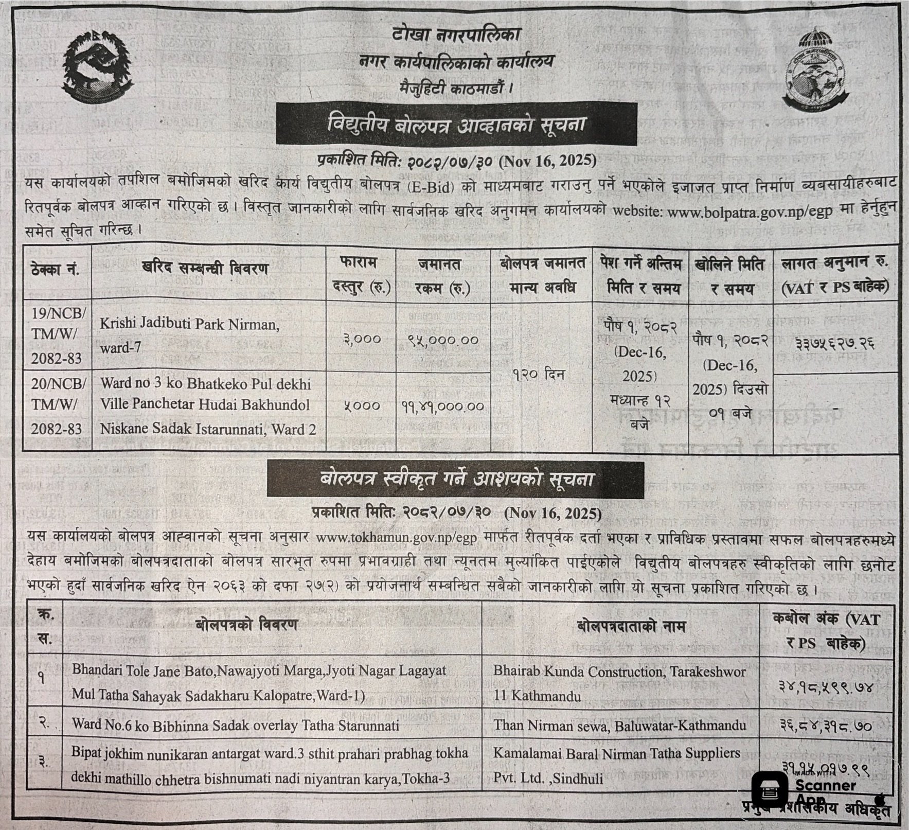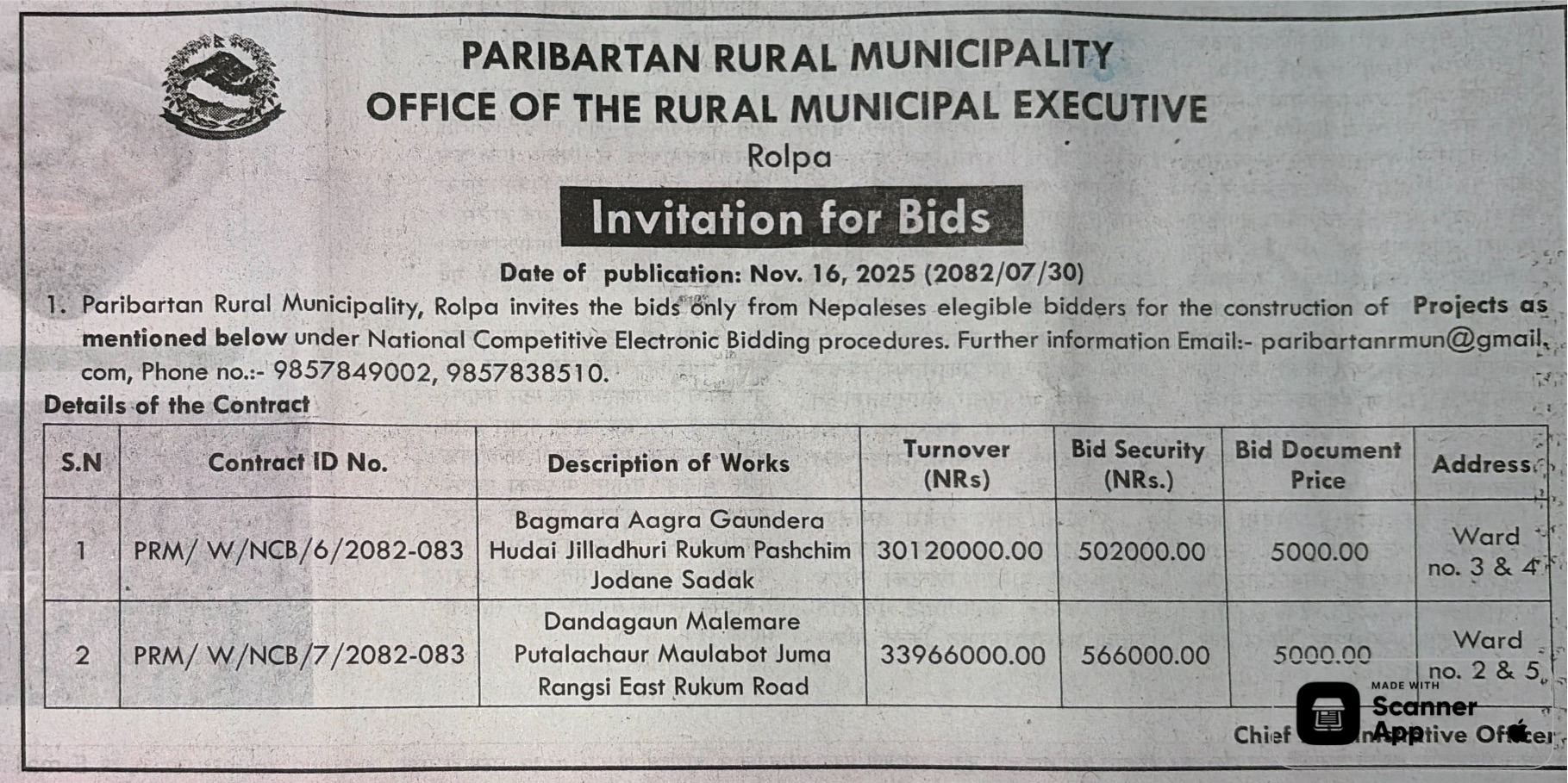 | 18 | IDOSYANGJA | Milan Chowk Tintale Patsaar Wada Karyalaya Sadak Staronnati Chapakot Na. Pa. 07, Syangja | 14/11/2025 | PPMO | 15/12/2025 | Click Here | |