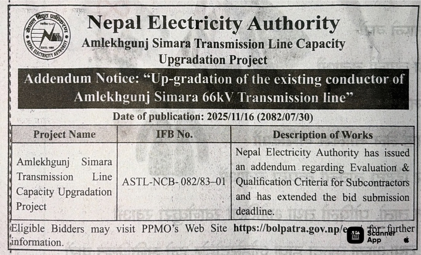 | 252 | NEA, Dhalkebar Grid | Supply and Delivery of Various Transmission Line Maintenance Tools | 14/11/2025 | PPMO | 14/12/2025 | Click Here | |