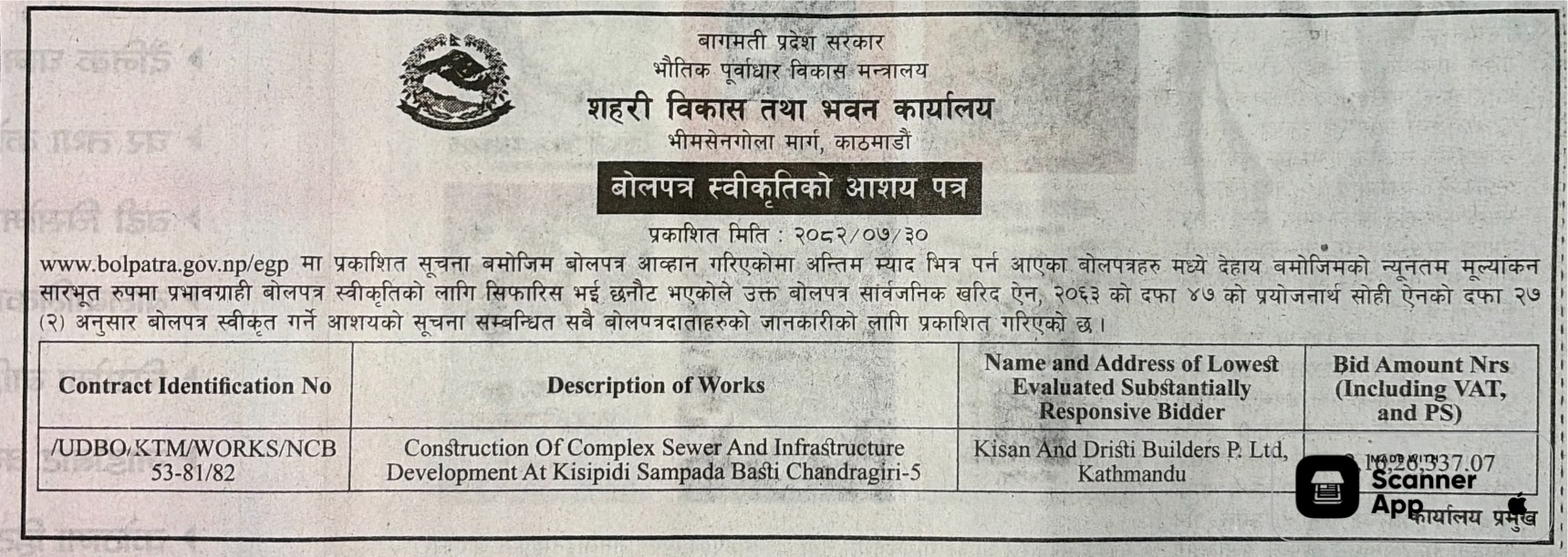 प्रदेश ३ मा प्रकाशित निर्माण सम्बन्धी बोलपत्र तथा आशयका सुचनाहरु