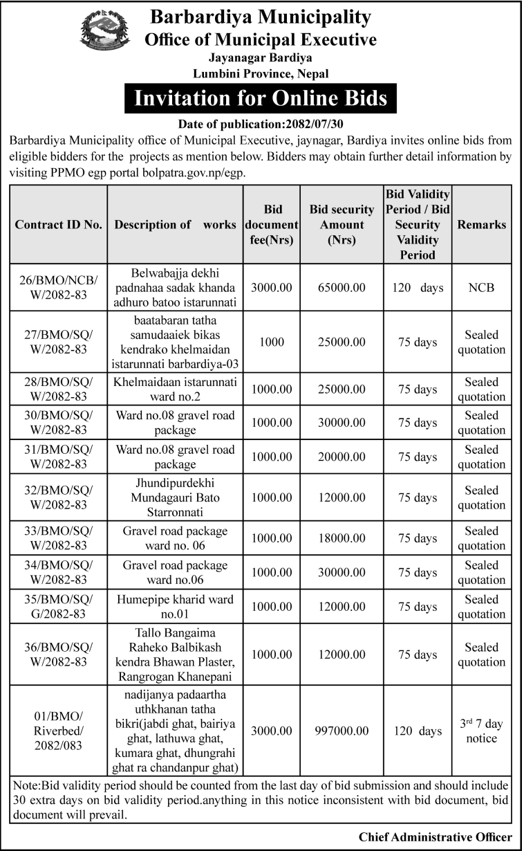 | 36 | Bhajani Municipality,Office of Municipal Executive | Construction of Various Prenmix carpet road in ward no 06 and 08 of Bhajani Municipality | 14/11/2025 | PPMO | 15/12/2025 | Click Here | |