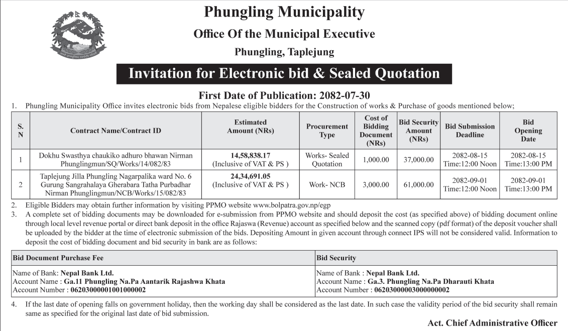 | 190 | Phungling Municipality, Taplejung | Upgrading work of Taplejung Jilla Phungling Nagarpalika Indian walfare Dekhi Ojahang Marga Hudai Timbure Sadak | 14/11/2025 | PPMO | 14/12/2025 | Click Here | |