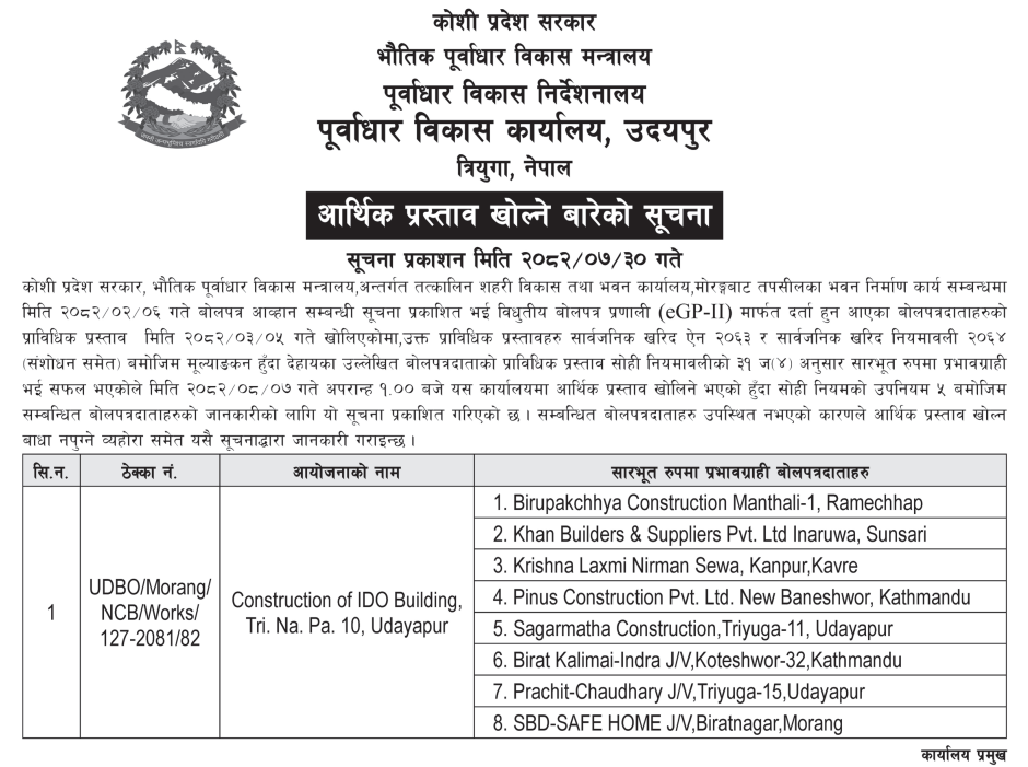 प्रदेश १ मा प्रकाशित निर्माण सम्बन्धी बोलपत्र तथा आशयका सुचनाहरु
