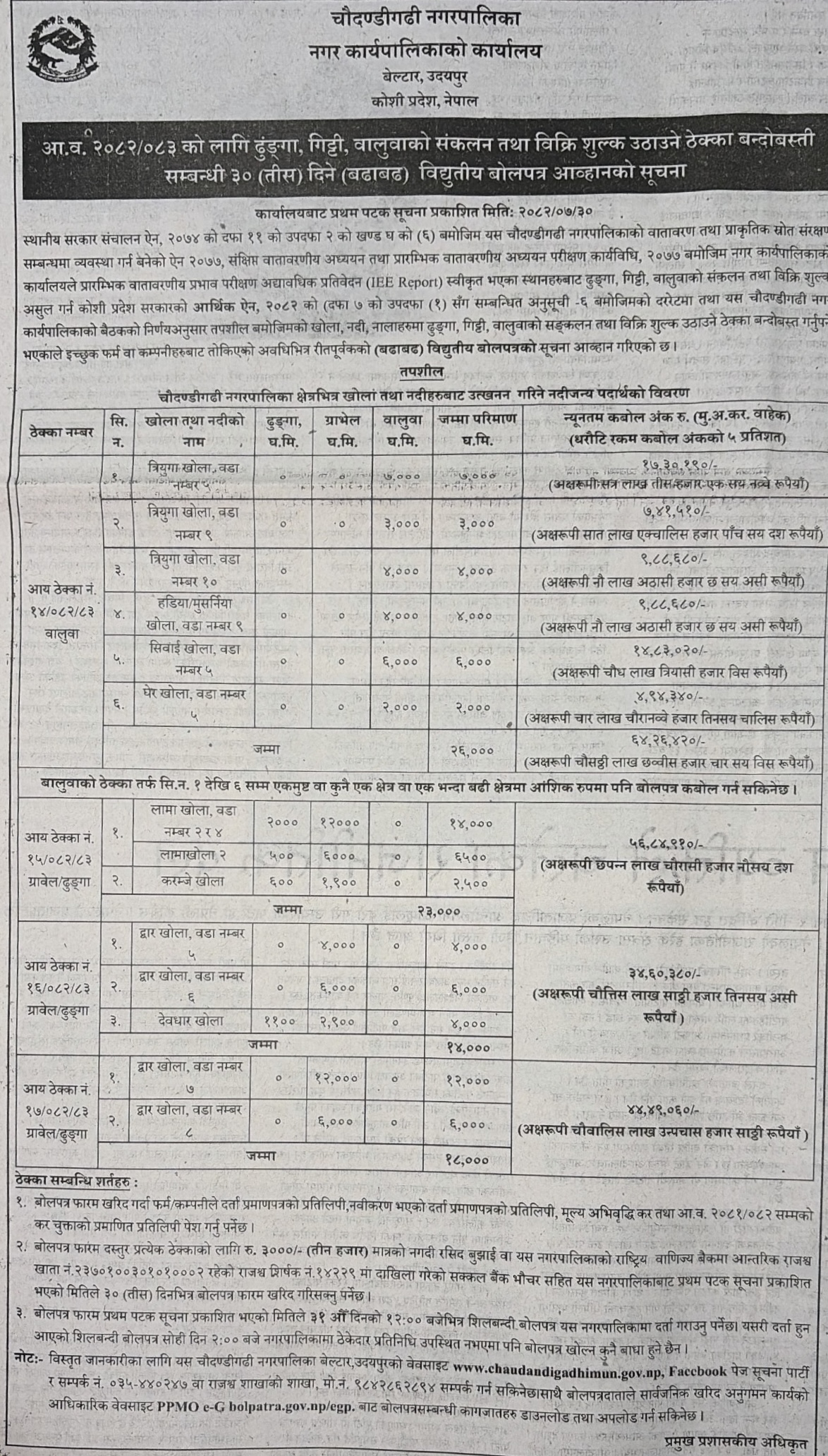 | 225 | Chaudandigadhi Municipality Office | charghare bhanjyang gadi durbar dhalan sadak nirman(kramagat) ward no.1 | 14/11/2025 | PPMO | 30/11/2025 | Click Here | |