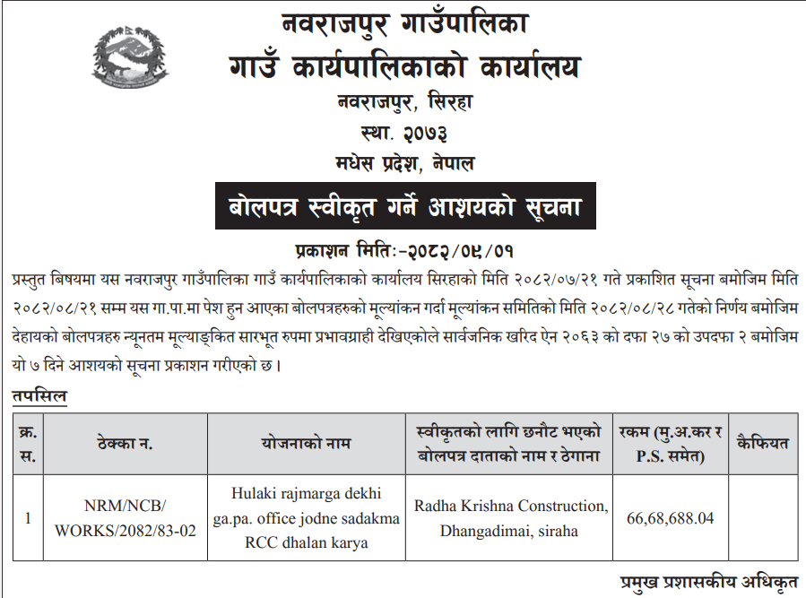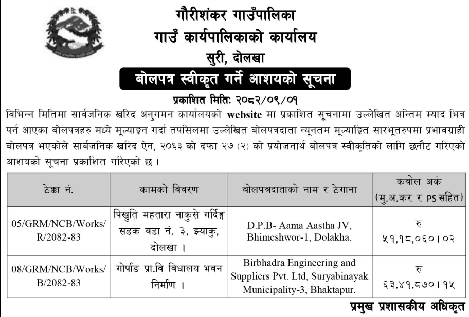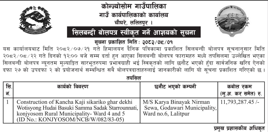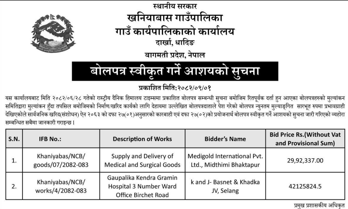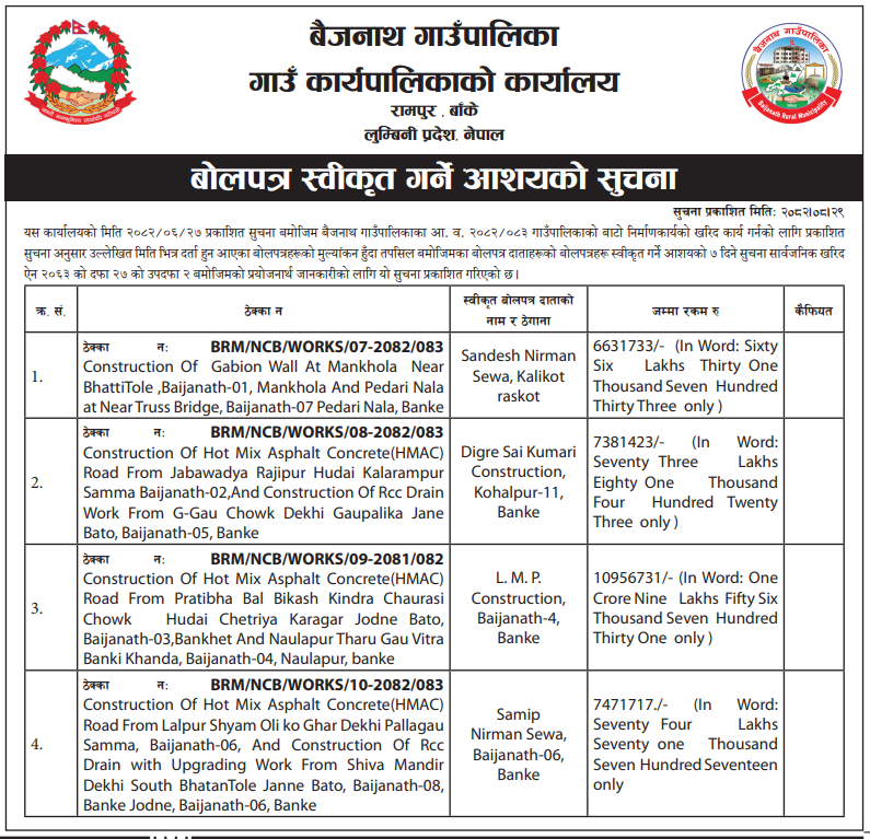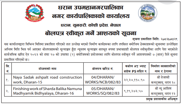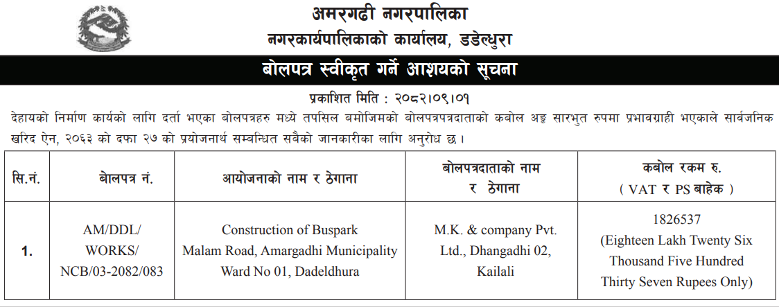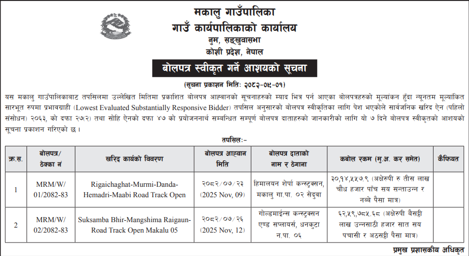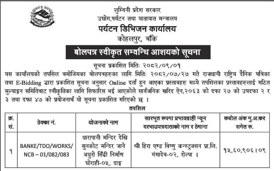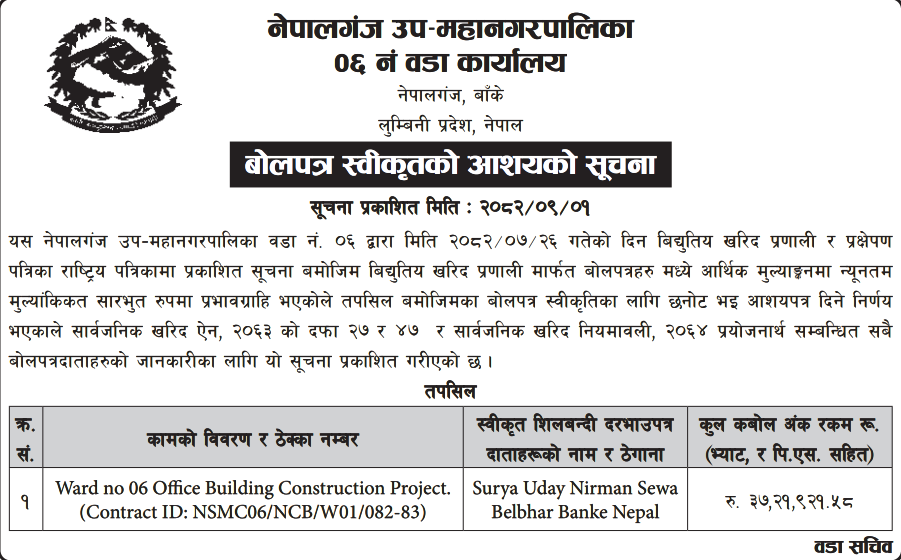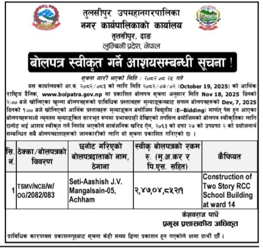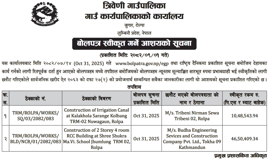 बोलपत्र स्विकृत ; Bid Award (Construction only) 16/12/2025 (Tuesday)