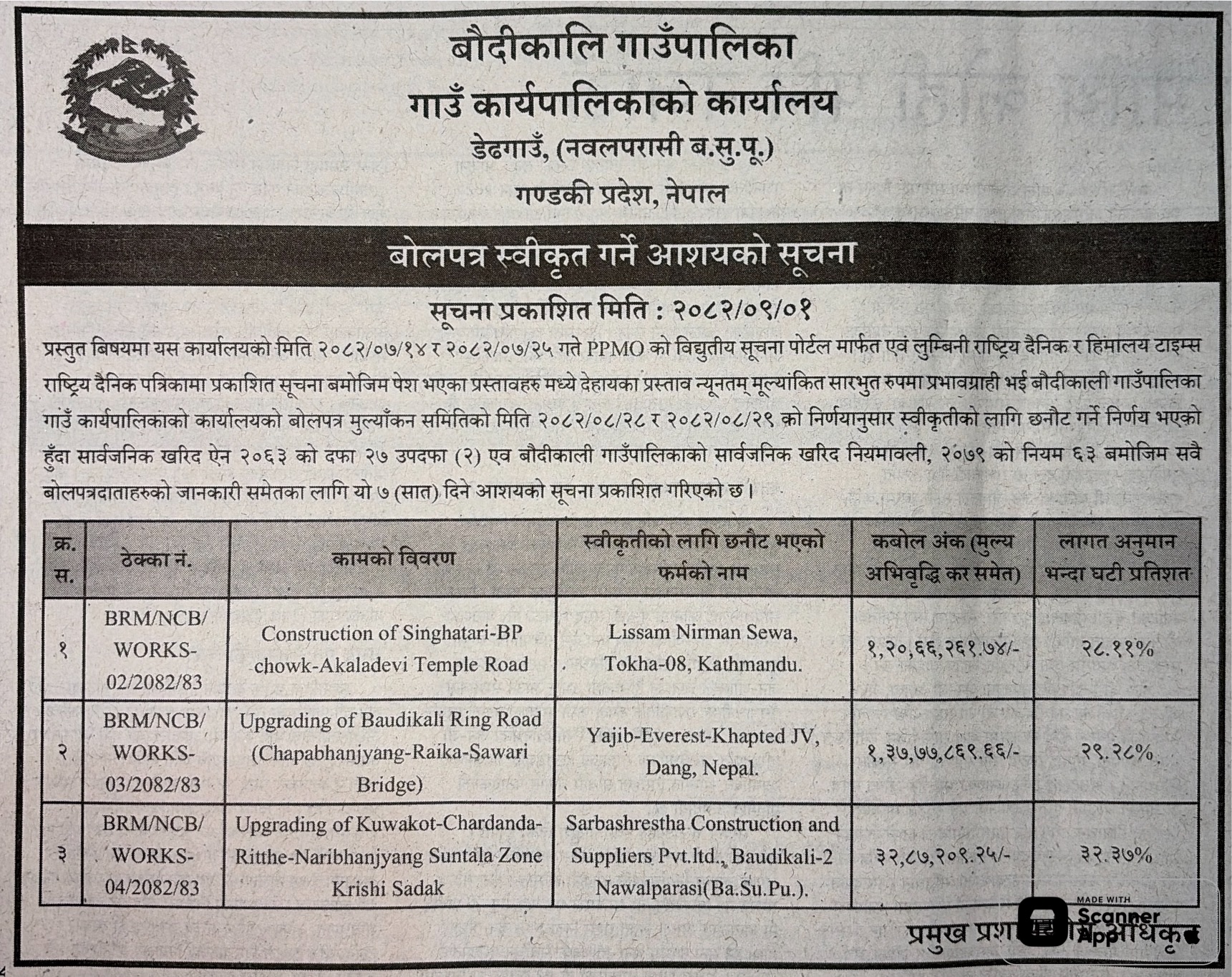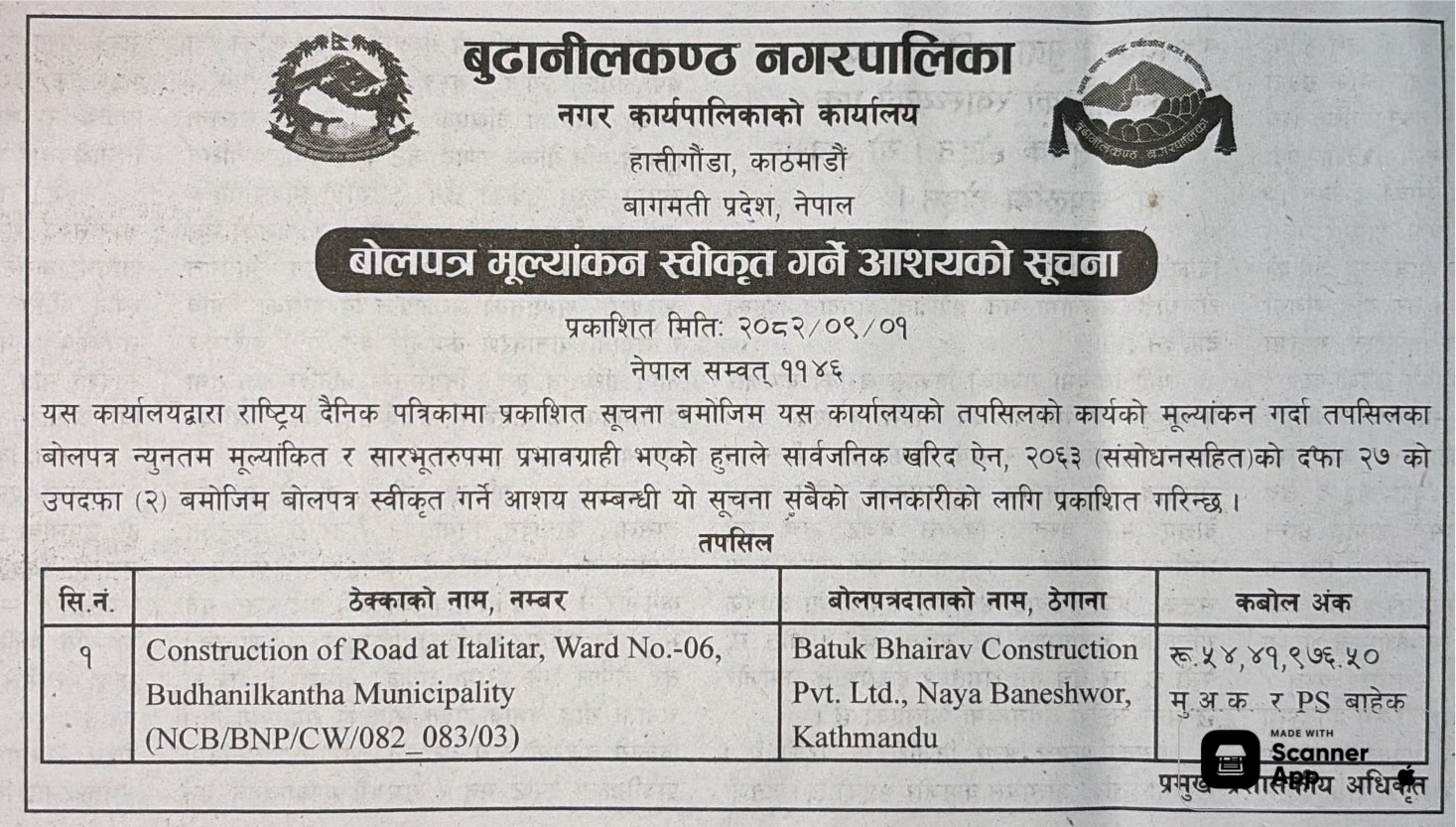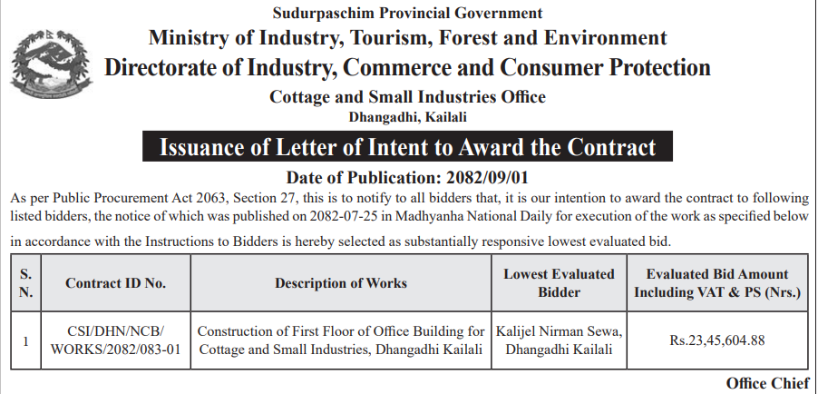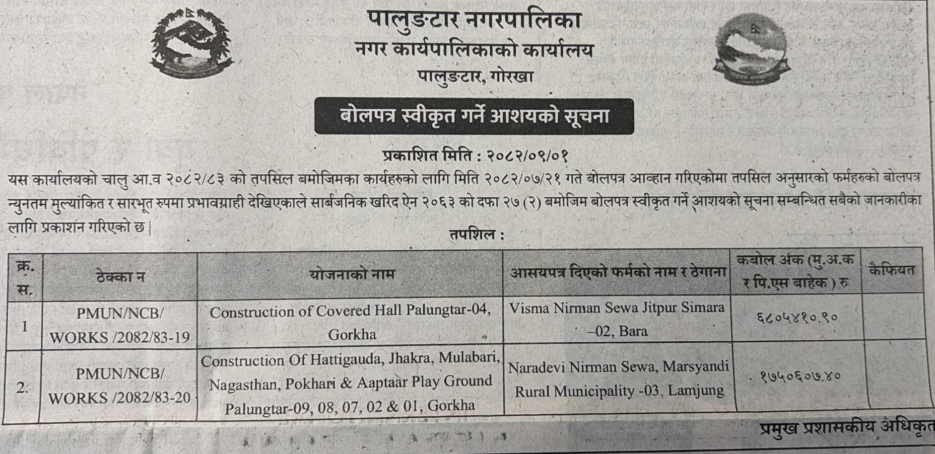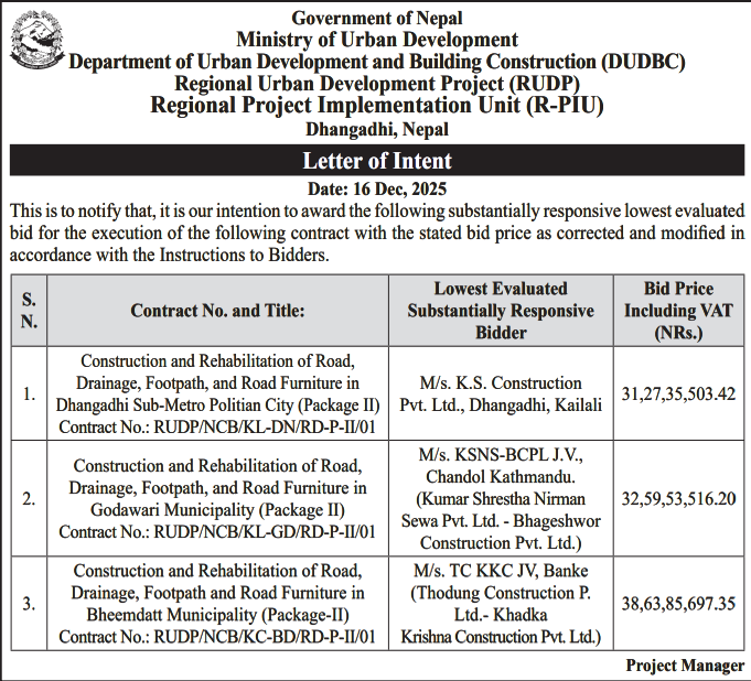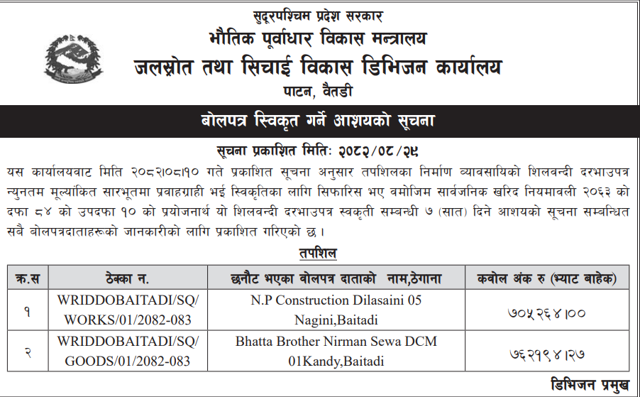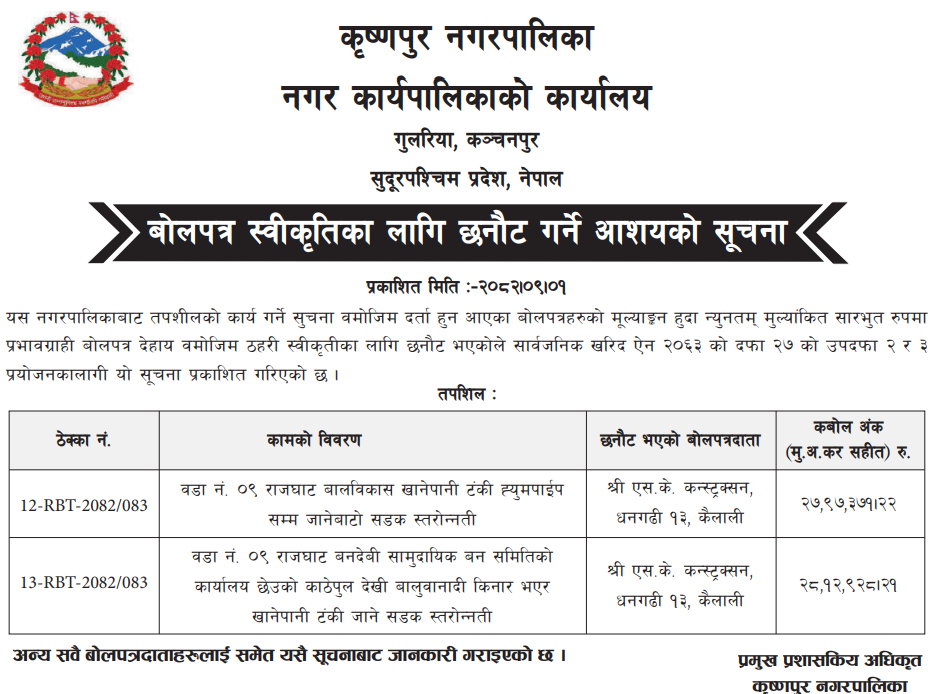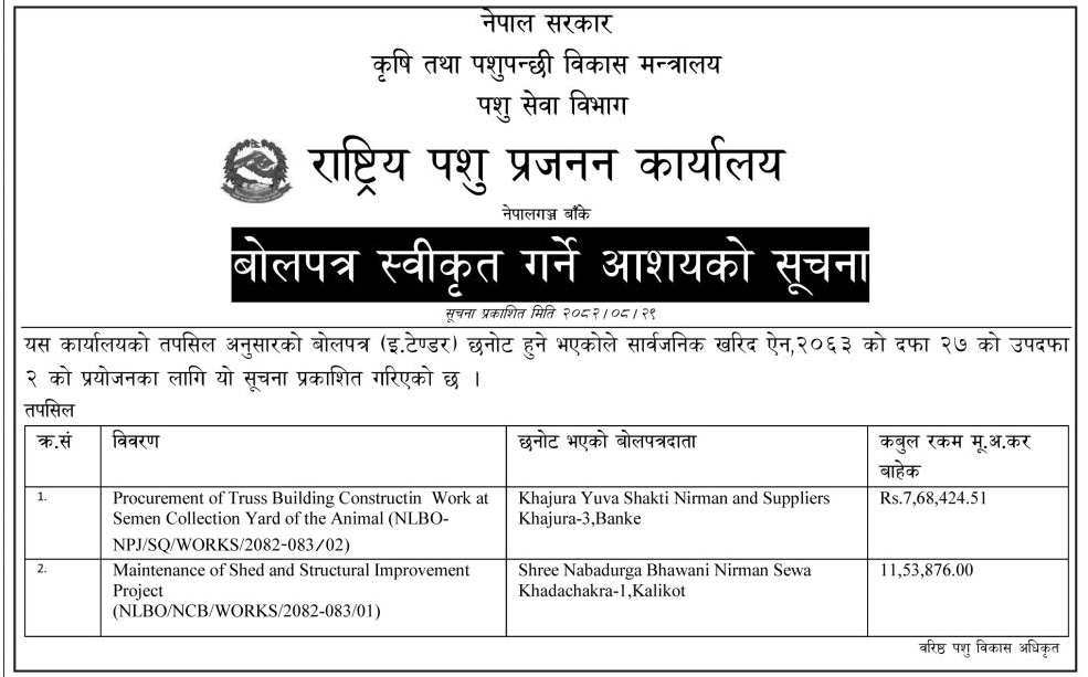 बोलपत्र स्विकृत ; Bid Award (Construction only) 16/12/2025 (Tuesday)