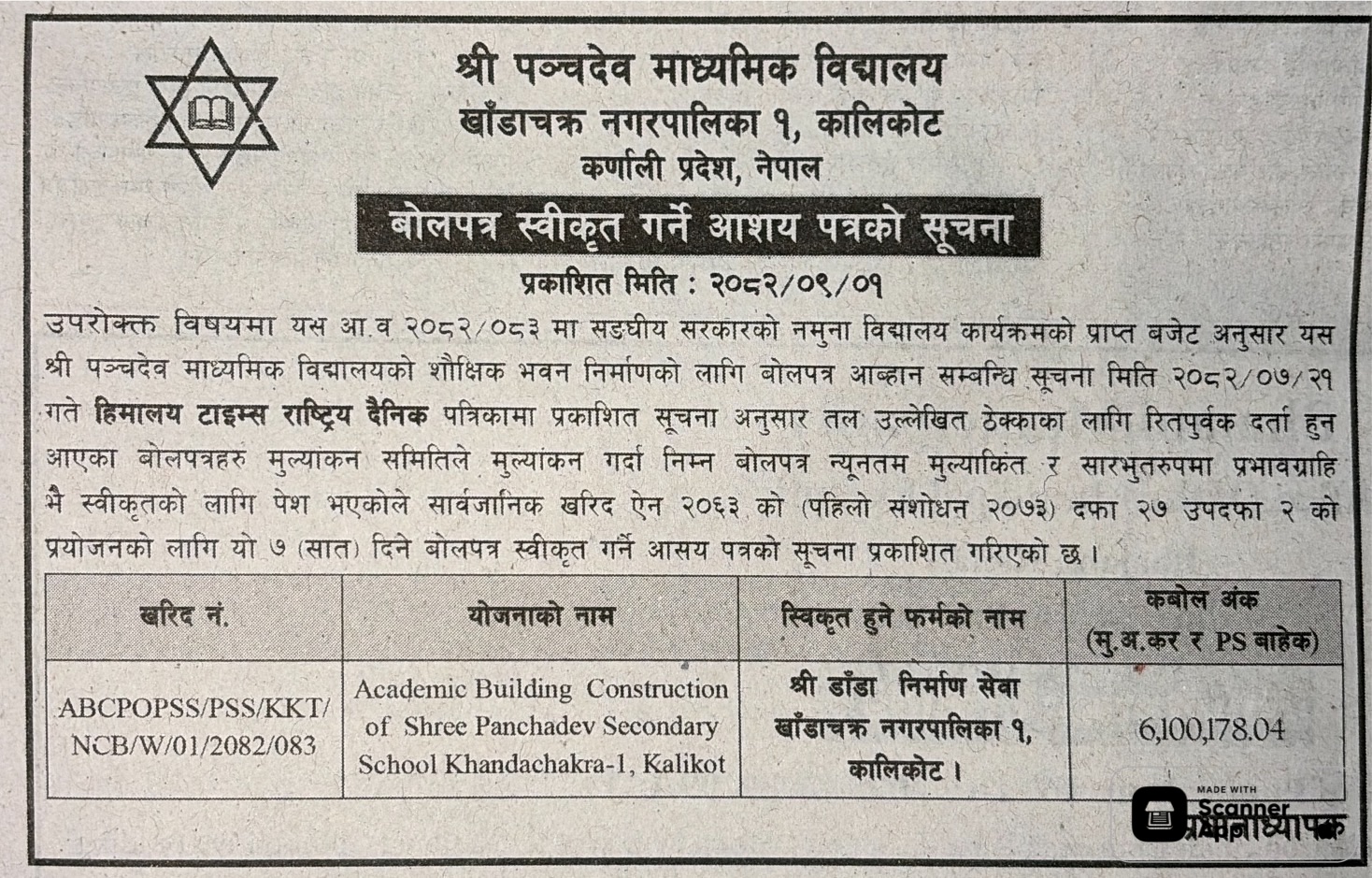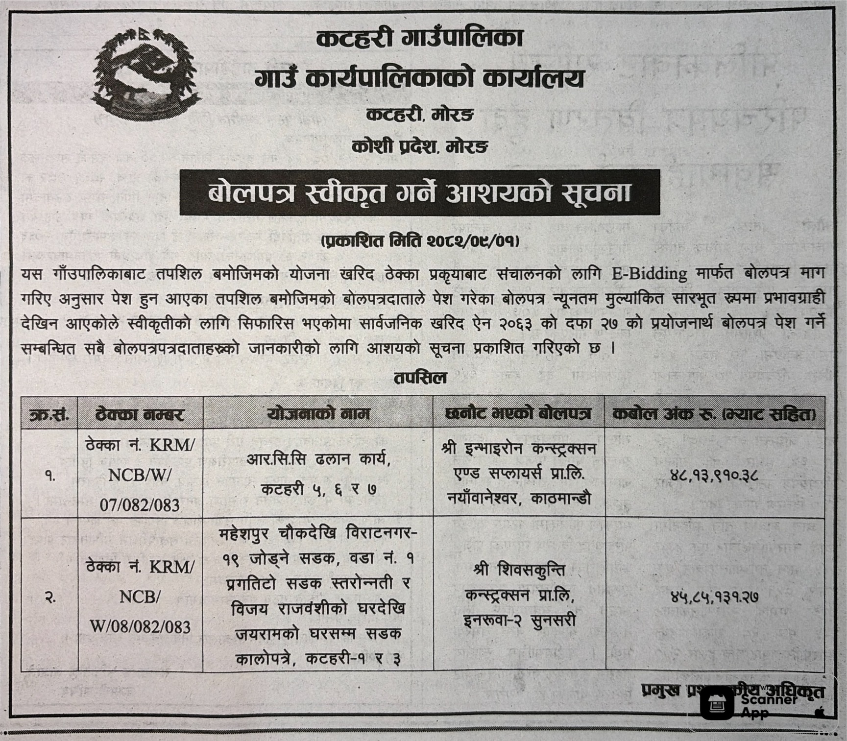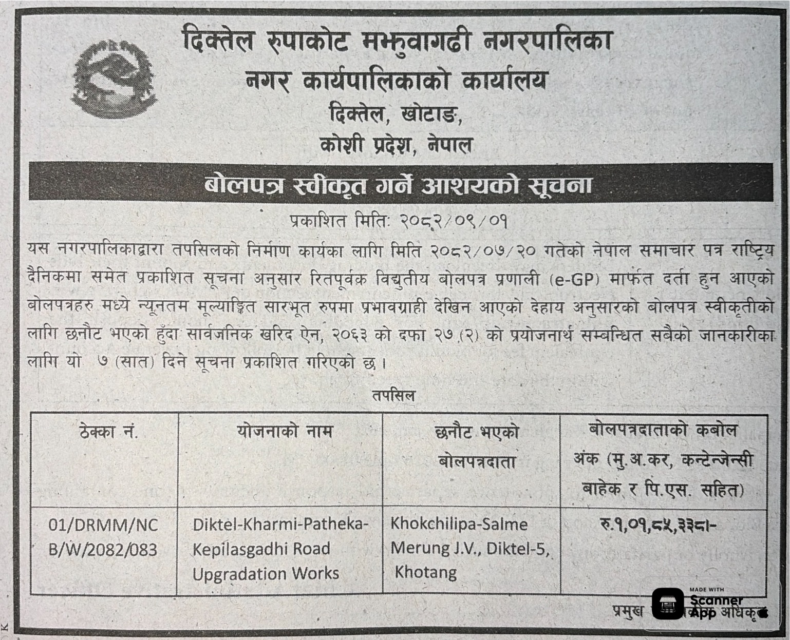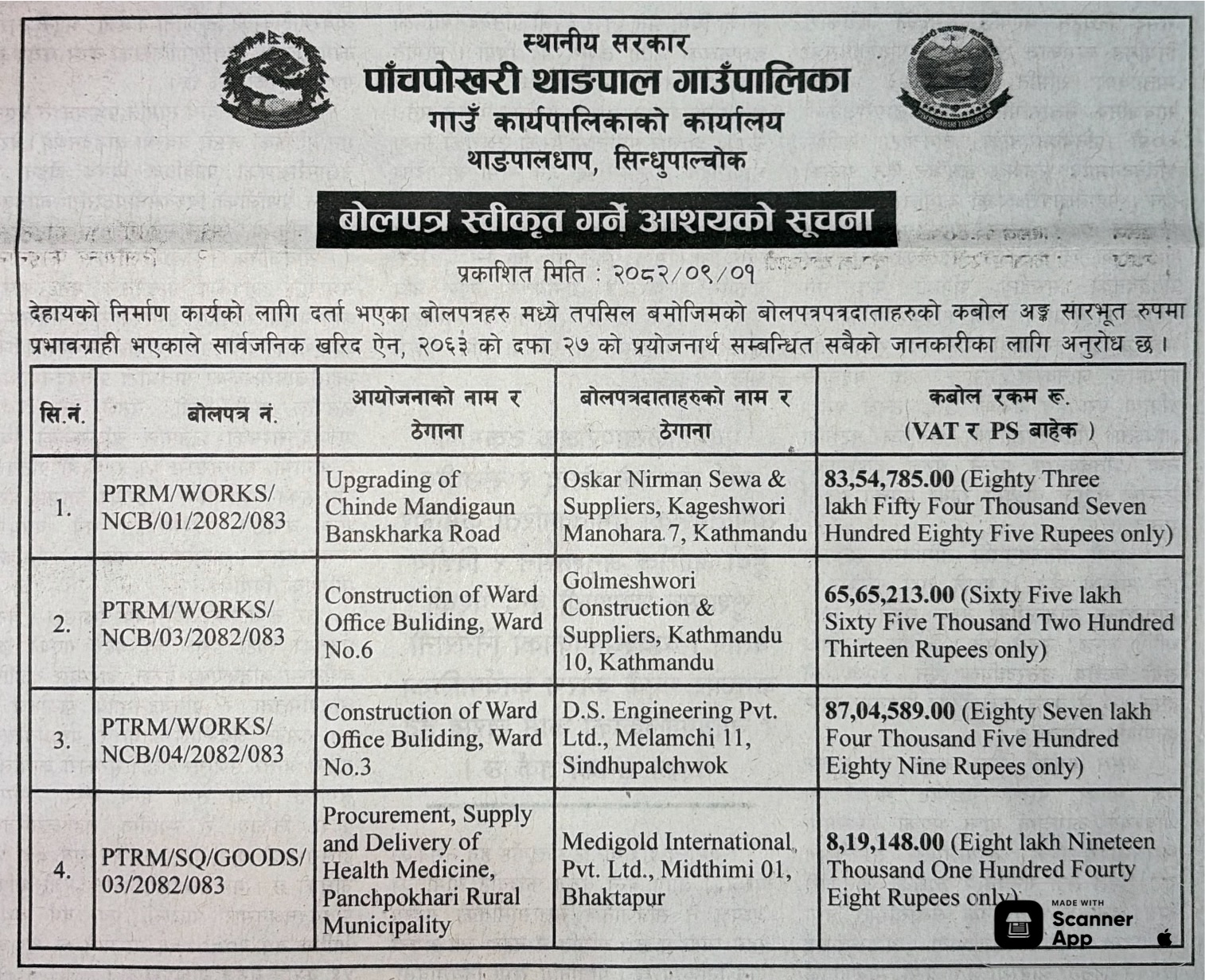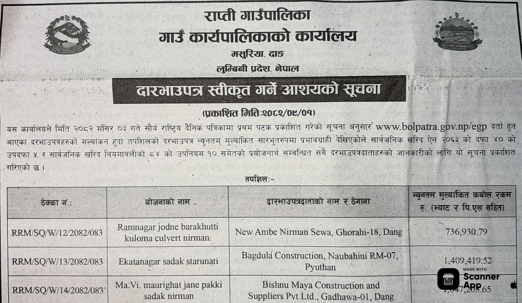 बोलपत्र स्विकृत ; Bid Award (Construction only) 16/12/2025 (Tuesday)