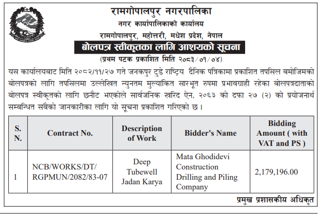 | 88 | GWRIDD, Sarlahi | Construction of 8/6 inch dia * 65 m depth Deep Tubewell with development works (all complete) at Gadhimai-4, Rautahat District | 16/04/2026 | PPMO | 01/05/2026 | Click Here | |