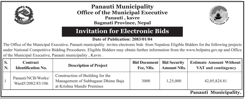 | 41 | Water Supply and Sanitation Division No5, Bhaktapur | Construction of Manohara Besi Khanepani StharUnnati Aayojana, Changunarayan-1, Bhaktapur | 16/04/2026 | PPMO | 18/05/2026 | Click Here | |