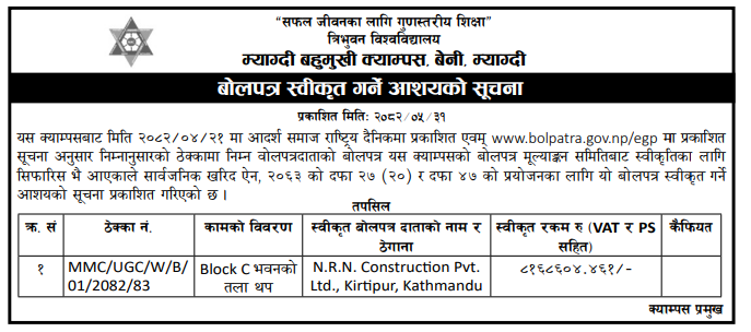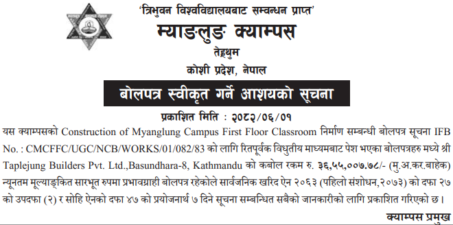 | 8 | Baglung Municipality | stone, Aggregate, sand, Subsistence and degraded material's Revenue Collection's Package no.3 Below Golden Bridge and 350 m upstream of Maldhunga North east Baglung Municipality-01 Baglung. | 16/09/2025 | PPMO | 16/10/2025 | Click Here | |