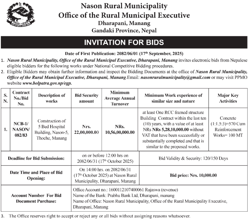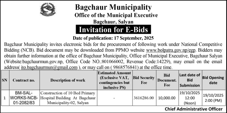 | 11 | Bhageshwor Rural Municipality | Construction Of Bhageshwor Health Post Building, Bhageshwor-03 | 16/09/2025 | PPMO | 16/10/2025 | Click Here | |
