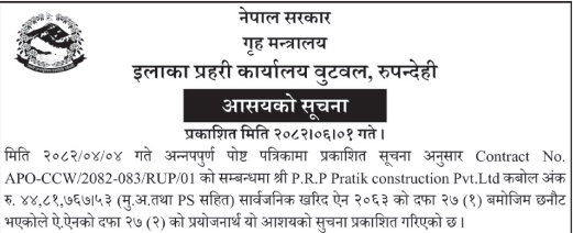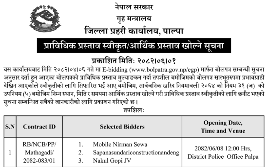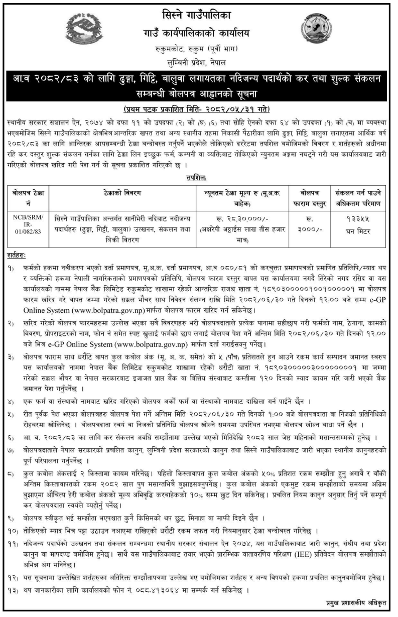 | 96 | Nisdi Rural Municipality | Selling of Dumped River Materials of Bhotaha Ghat Nisdi-01 Bakamalang Palpa. | 16/09/2025 | PPMO | 16/10/2025 | Click Here | |