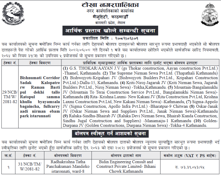 | 21 | Halesi Tuwachung Municipality Office | Holesung Park Dekhi Rock Garde Jane Sadak Upgrading Works | 16/09/2025 | PPMO | 16/10/2025 | Click Here | |