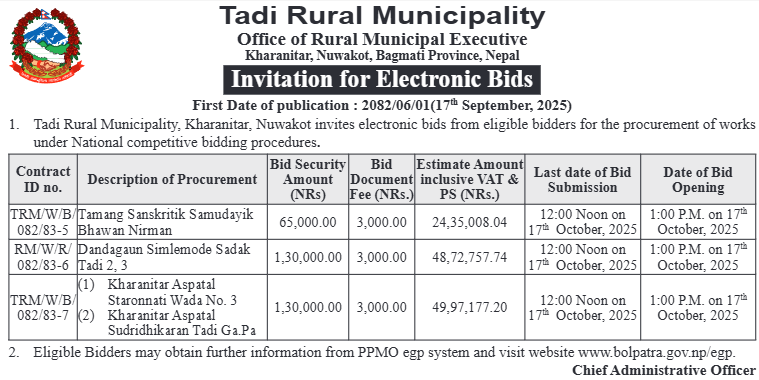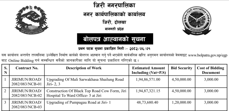 | 2 | Bhumlu Rural Municipality | 54 Kilo Numbari Danda Palanchok jane Sadak Staronnati | 16/09/2025 | PPMO | 17/10/2025 | Click Here | |