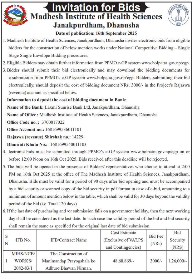 | 49 | Madhesh Institute of Health Sciences | MANIMANDAP PRAYOGSHALAKO ADHURO BHAWAN NIRMAN | 16/09/2025 | PPMO | 16/10/2025 | Click Here | |