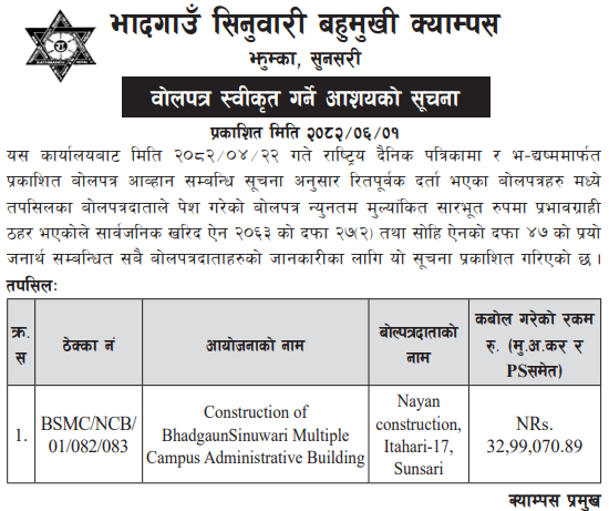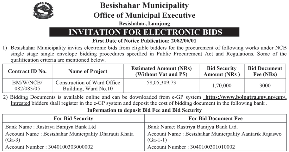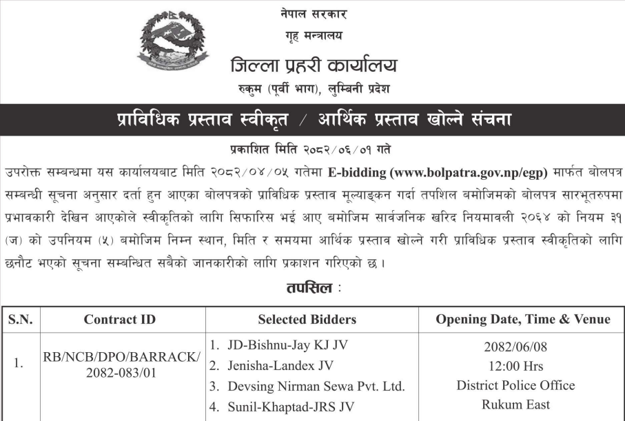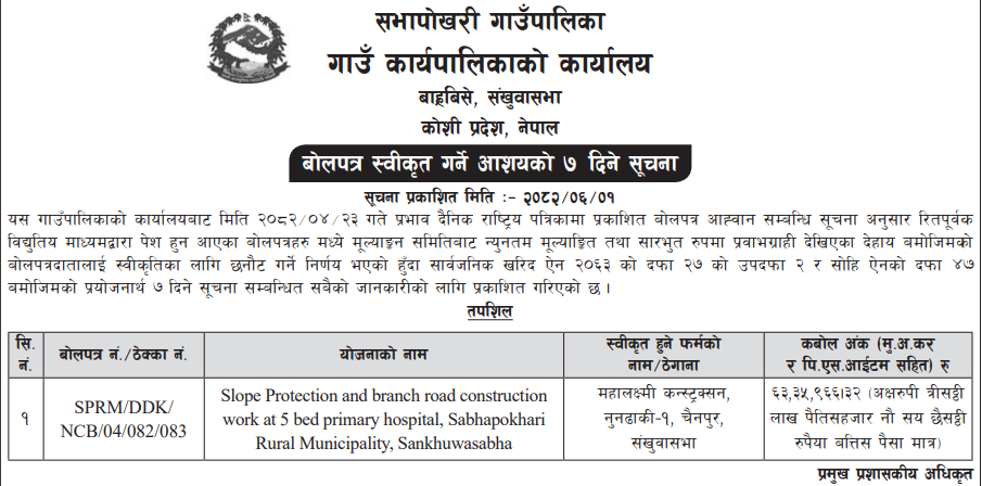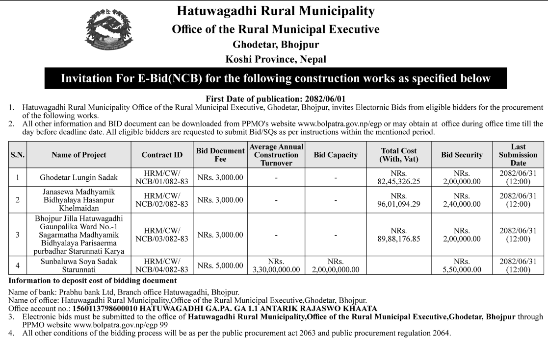 | 1 | Bhagawatimai Rural Municipality | Katti Health post Building Construction Works, ward no 5. | 16/09/2025 | PPMO | 17/10/2025 | Click Here | |