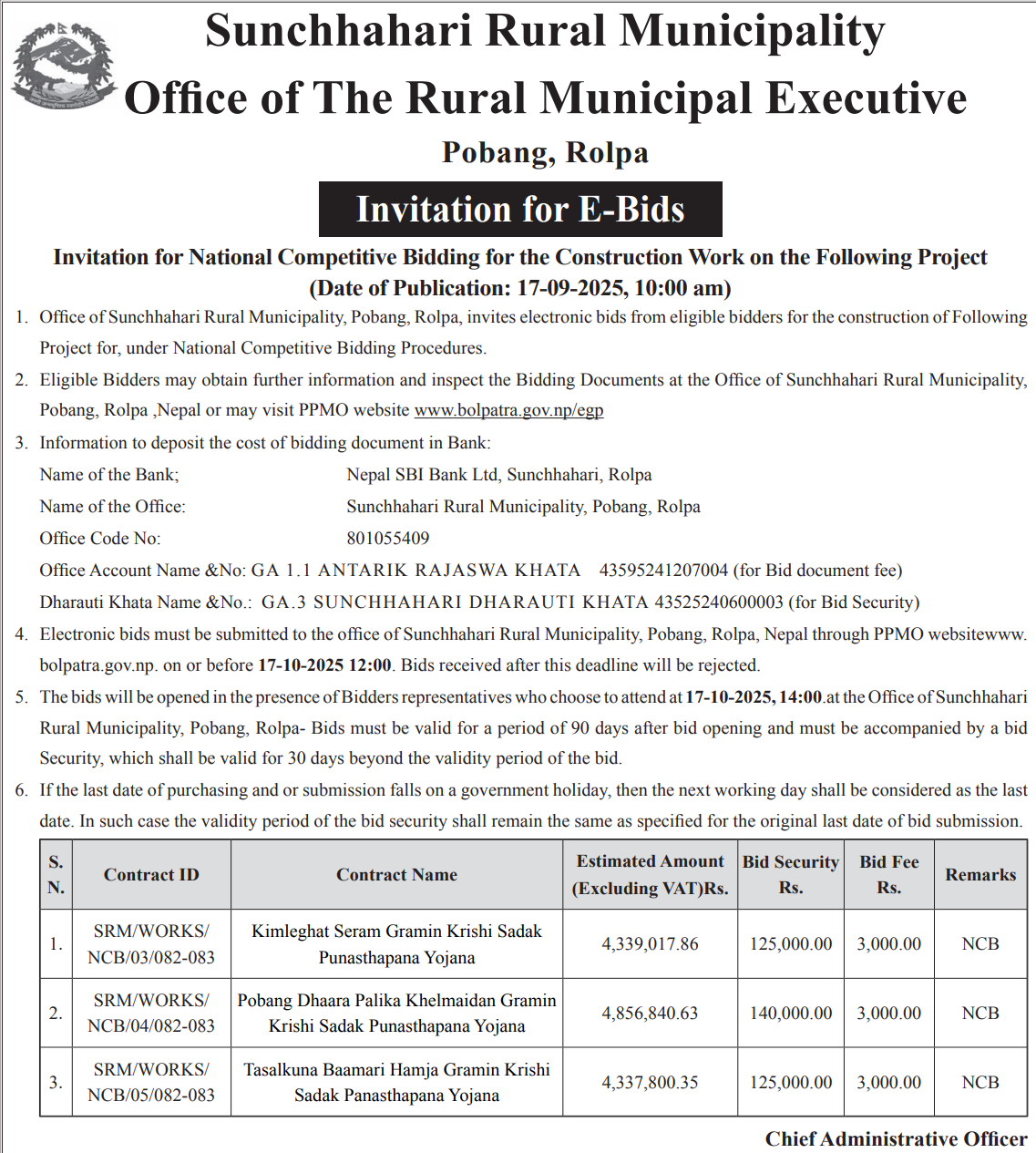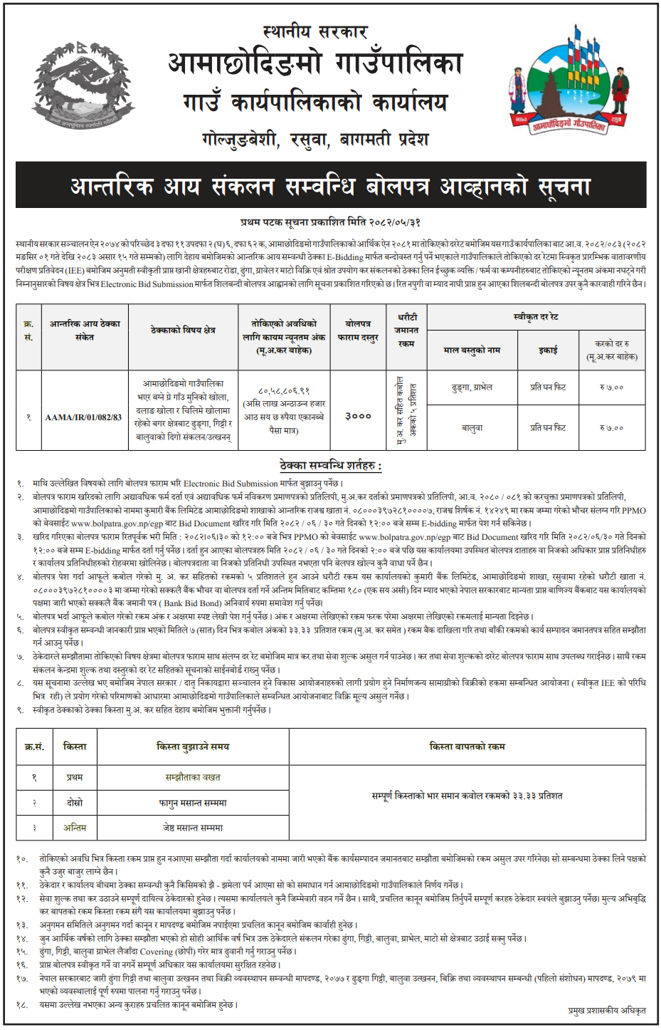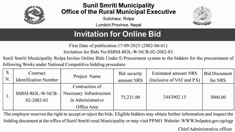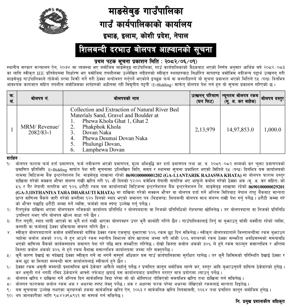 | 5 | Gokulganga Rural Municipality, Ramechhap | Collection of Internal Revenue Fee for Sales of Mining Stone Excavation, gravel, aggregates, Stone, Soil, Dust etc. | 16/09/2025 | PPMO | 17/10/2025 | Click Here | |