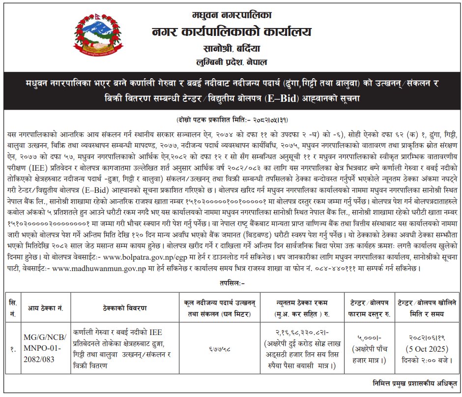 | 103 | Madhuban Municipality, Bardiya | Karnali Geruwa ra Babai nadi ko IEE pratibedan le tokeko chetra haru bata dhunga, gitti tatha baluwa utkhanan/sankalan ra bikri. | 16/09/2025 | PPMO | 05/10/2025 | Click Here | |