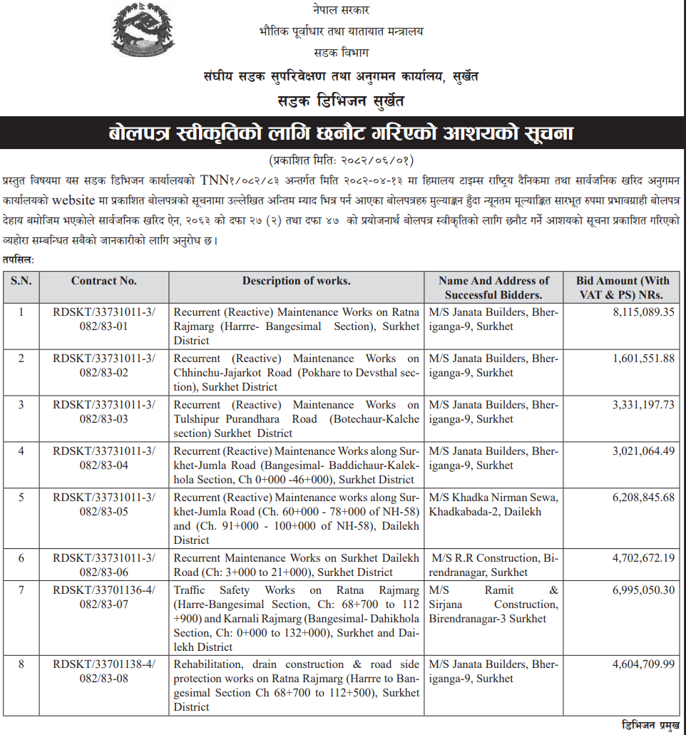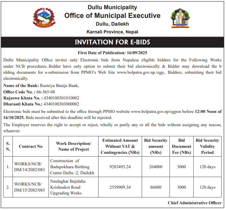 | 65 | Dullu Municipality Office | Naulaghar Bajidaha Krishnakot Road Upgrading works | 16/09/2025 | PPMO | 16/10/2025 | Click Here | |