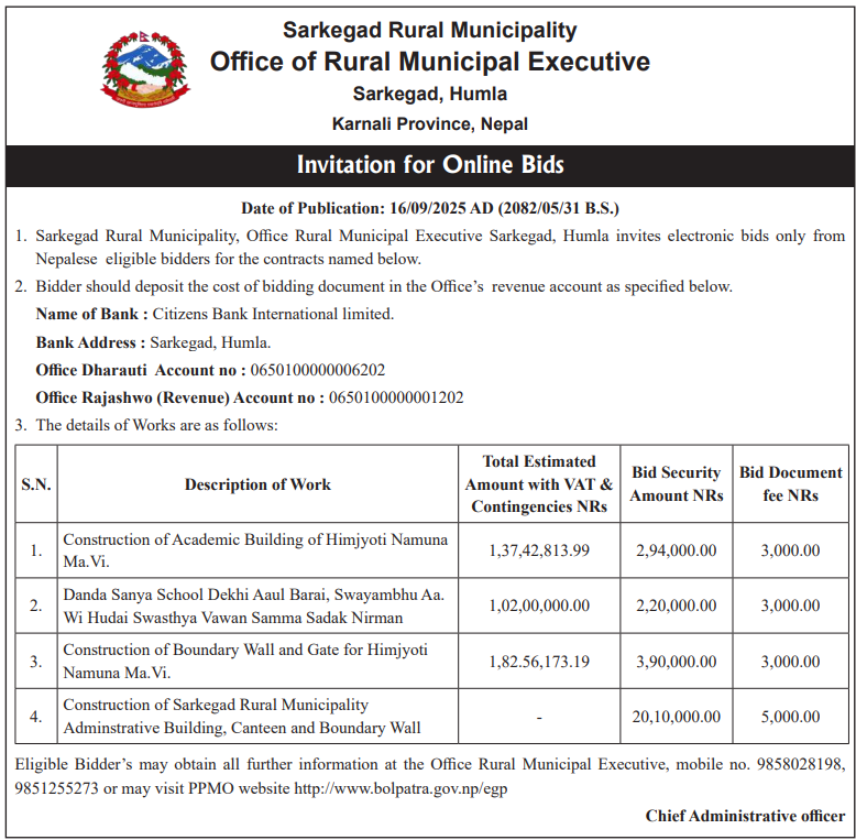 | 58 | Sarkegad Rural Municipality | Construction of Sarkegad Rural Municipality Administrative Building, Canteen and Boundary wall | 16/09/2025 | PPMO | 16/10/2025 | Click Here | |