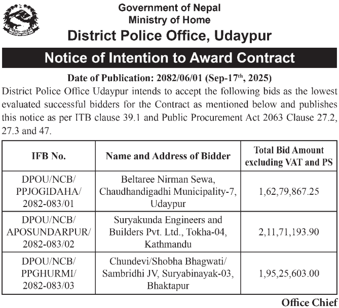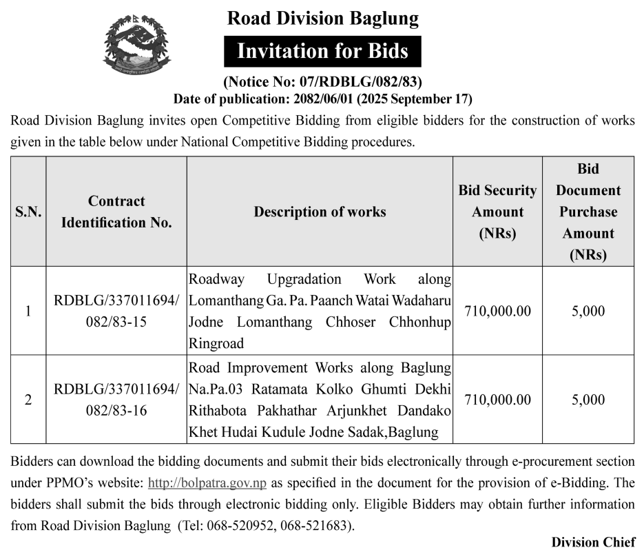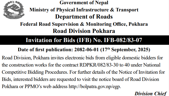 | 38 | Road Infrastructure Development Office, Gulmi | Upgrading of Barbot-Wagla-Chautara-Ajmir-Kafalpata-Riyale-Batakachaur-Pokhara-Road. (Chautara-Wagla-Rajasthal-Barbot-Section), Dhurkot Ga. Pa, 07 Gulmi &Upgrading of Dwaneta-Dekhi-Bhirbari-SimSamma-RCC-Road. Dhurkot Ga.Pa, 07 Gulmi. | 16/09/2025 | PPMO | 16/10/2025 | Click Here | |
