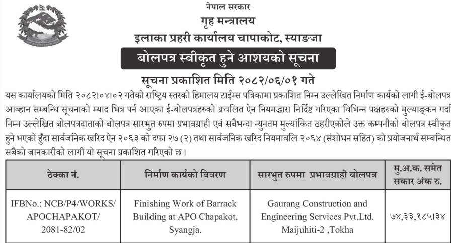 प्रदेश ४ मा प्रकाशित निर्माण सम्बन्धी बोलपत्र तथा आशयका सुचनाहरु