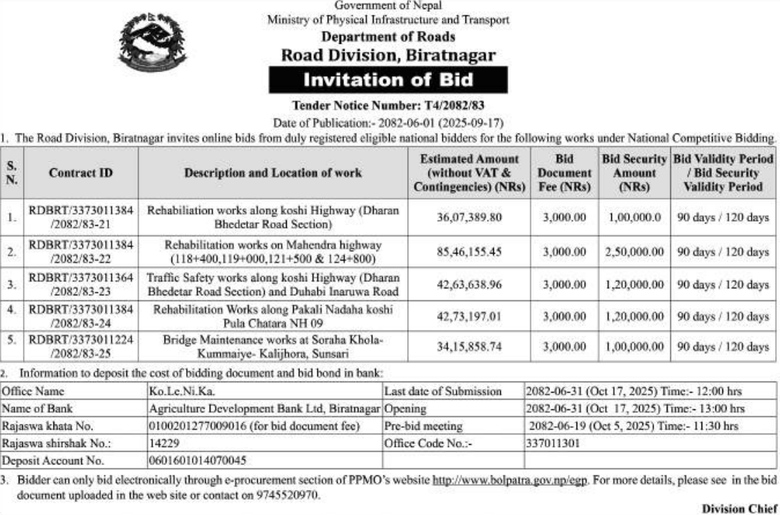 निर्माण सम्बन्धी प्रकाशित सम्पूर्ण ठेक्का टेन्डर तथा बोलपत्र सुचनाहरु प्रदेश अनुसार 17/09/2025 (Wednesday)