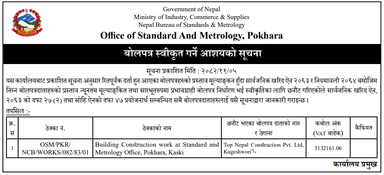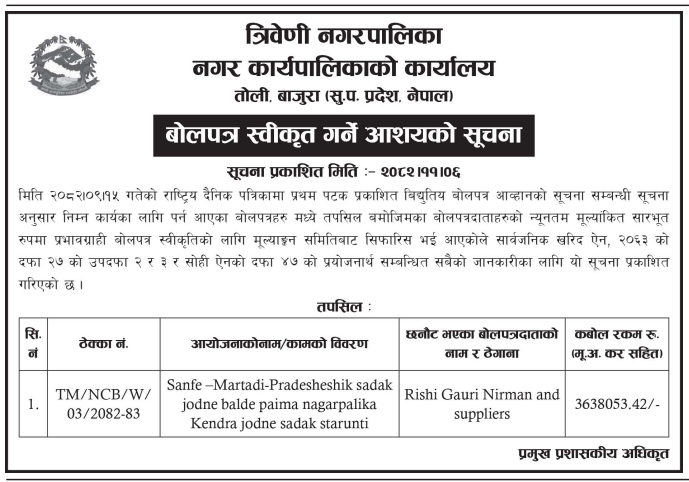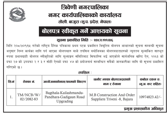 बोलपत्र स्विकृत ; Bid Award (Construction only) 18/02/2025 (Wednesday)