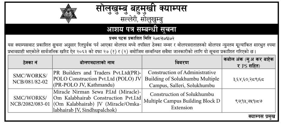 प्रदेश ५ मा प्रकाशित निर्माण सम्बन्धी बोलपत्र तथा आशयका सुचनाहरु