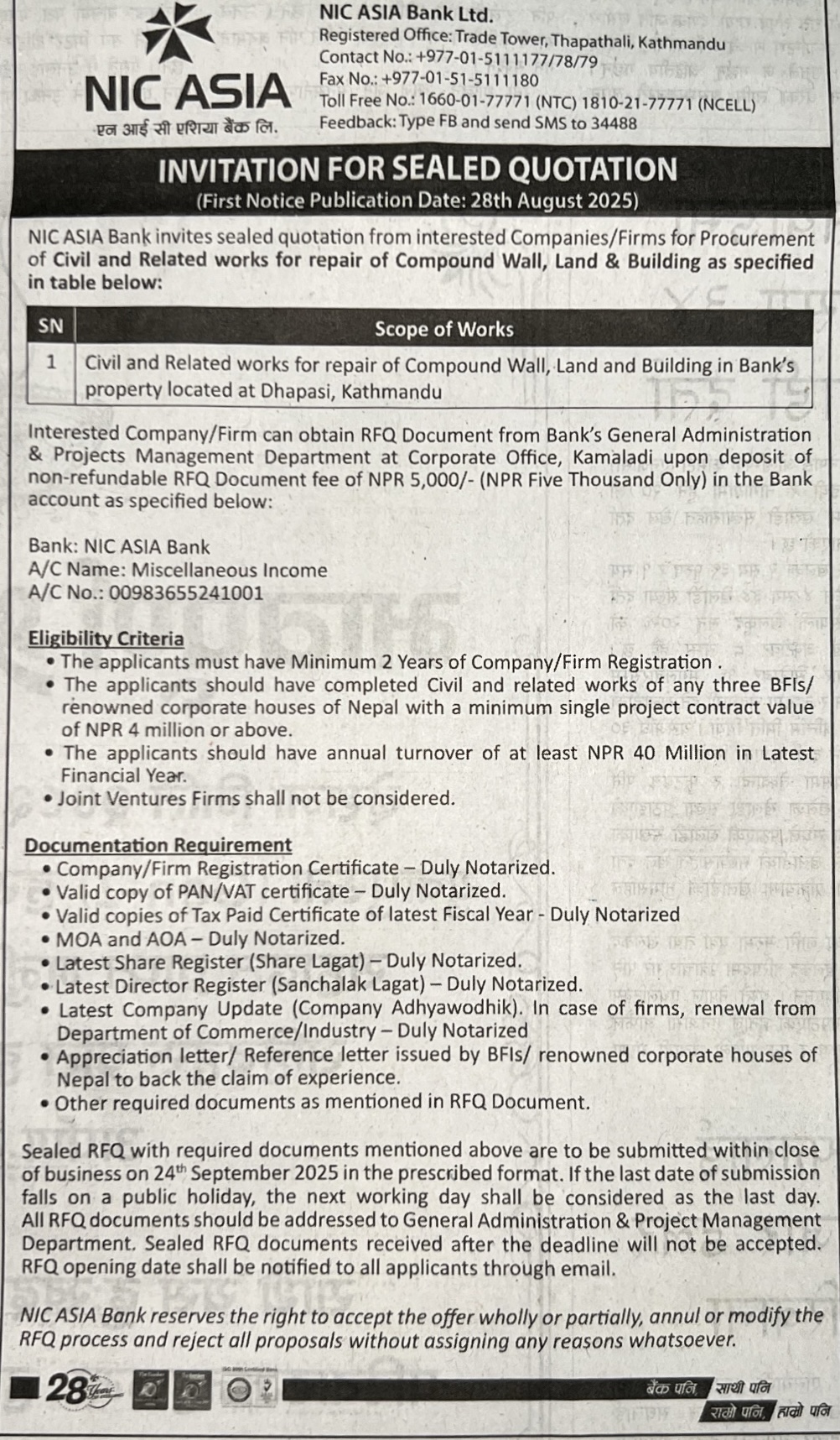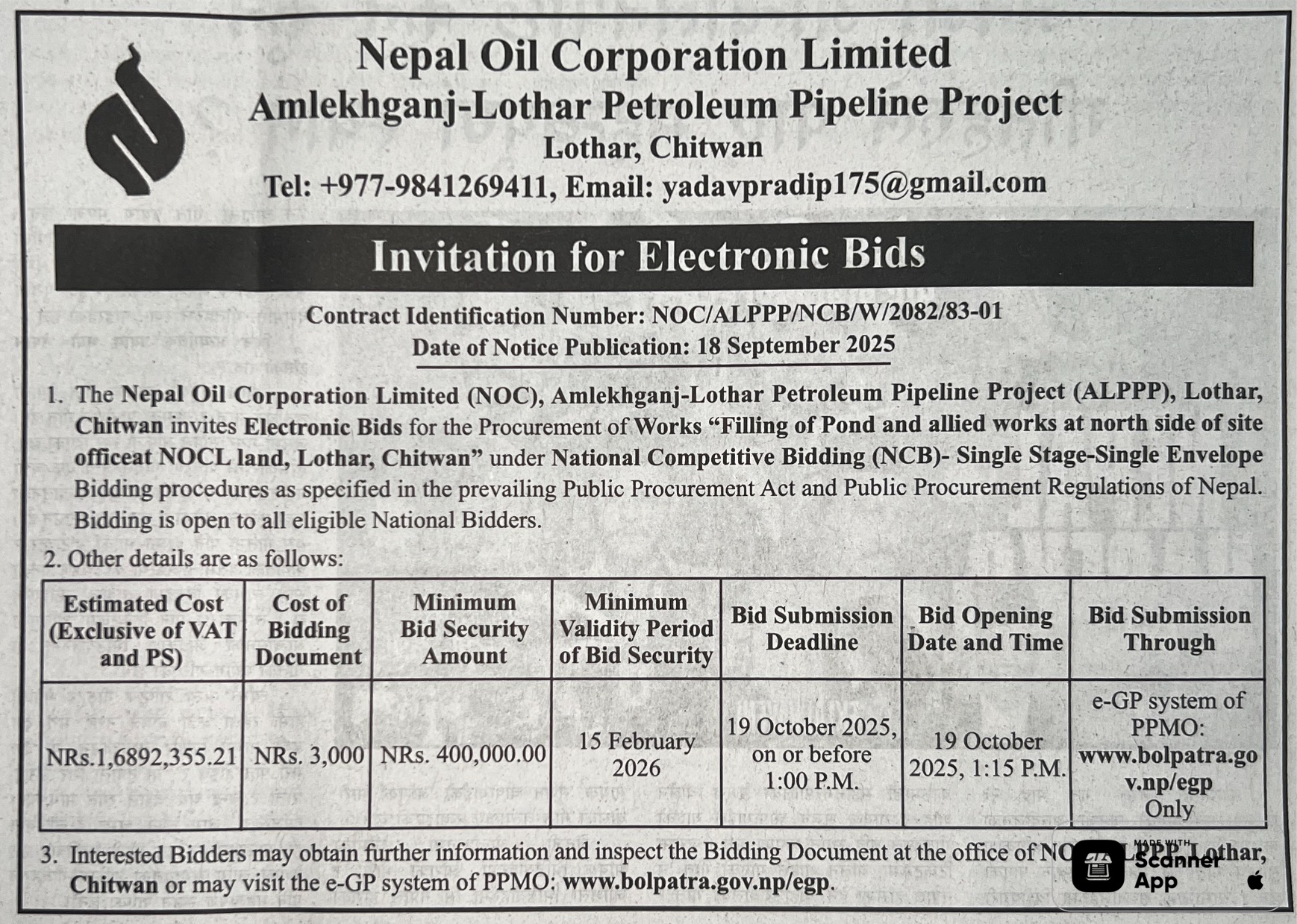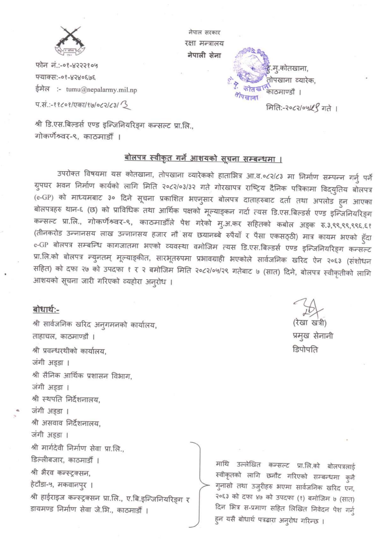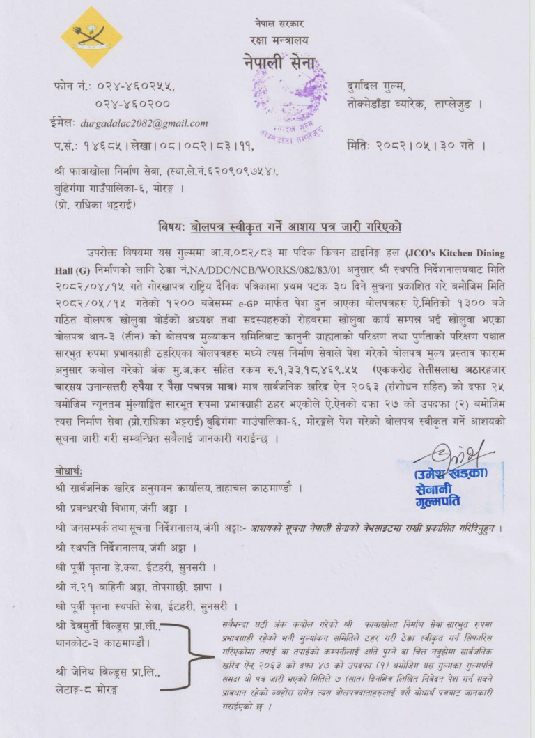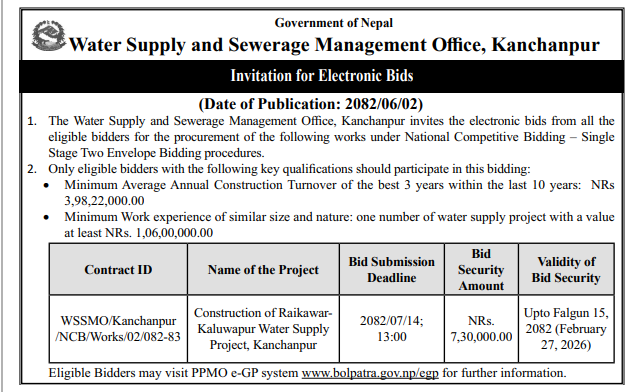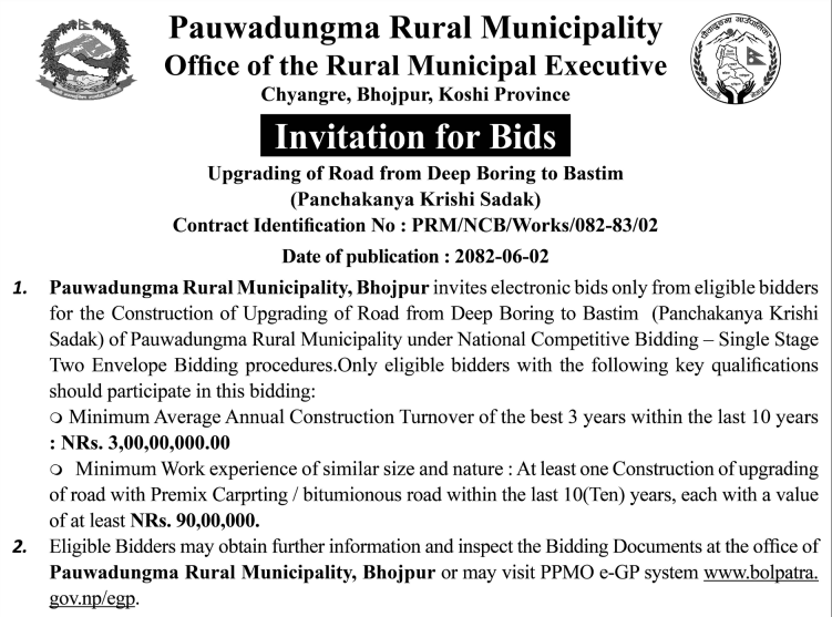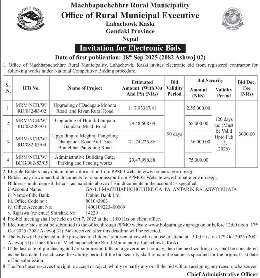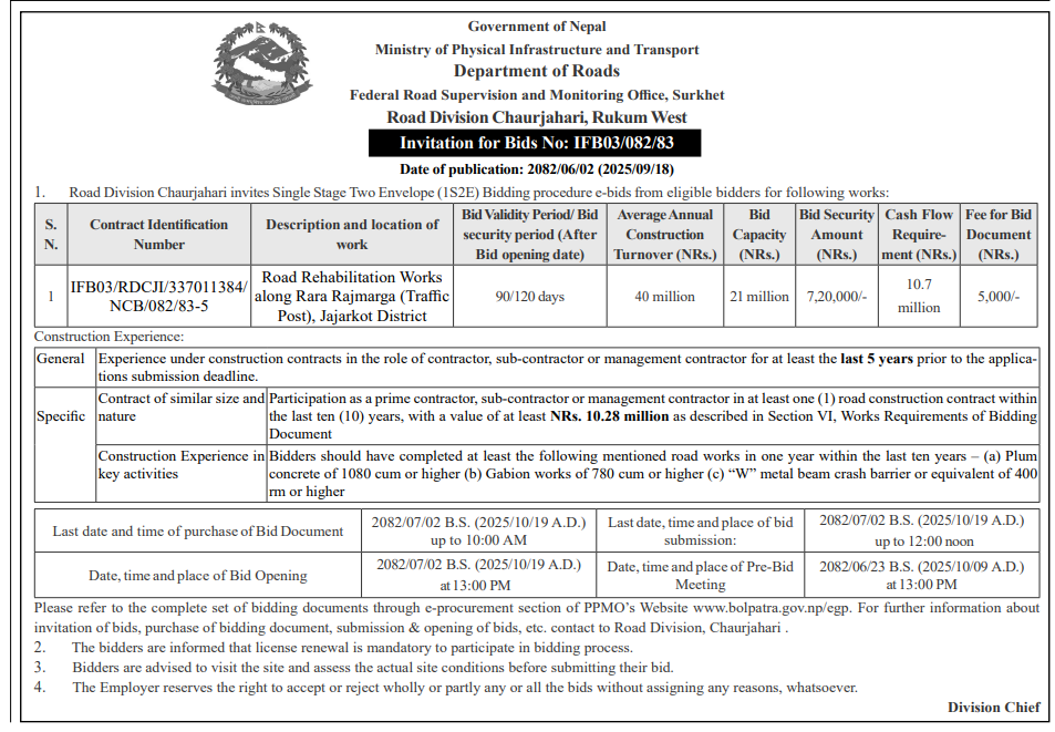 | 53 | 302 Division Road Office Pokhara | Upgrading of Road Srijana - Paudur - Salyan Kaski Parbat Annapurna Gaupalika | 17/09/2025 | PPMO | 17/10/2025 | Click Here | |