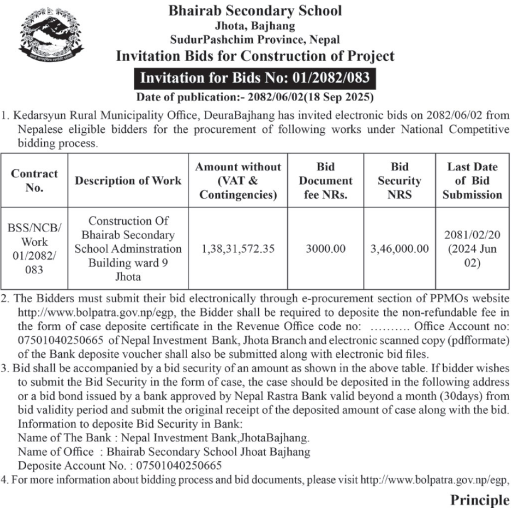 | 49 | Hatuwagadhi Rural Municipality | Bhojpur Jilla Hatuwagadhi Gaunpalika Ward No. 1 Sagarmatha Madhyamik Bidhyalaya Parisarmaa Purbadhar starunnati Karya | 17/09/2025 | PPMO | 17/10/2025 | Click Here | |