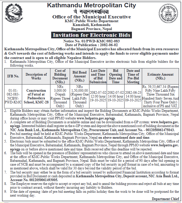 | 62 | Jiri Municipality, Dolakha | Upgrading Of Mali Sarwakhasa Shailung Road jiri-2,3 | 17/09/2025 | PPMO | 17/10/2025 | Click Here | |