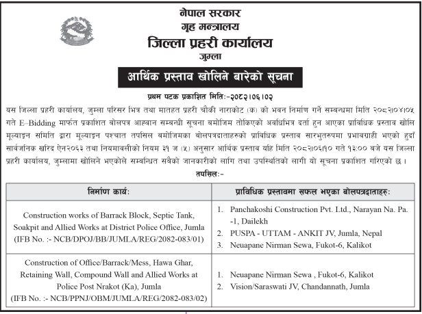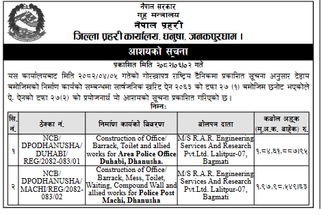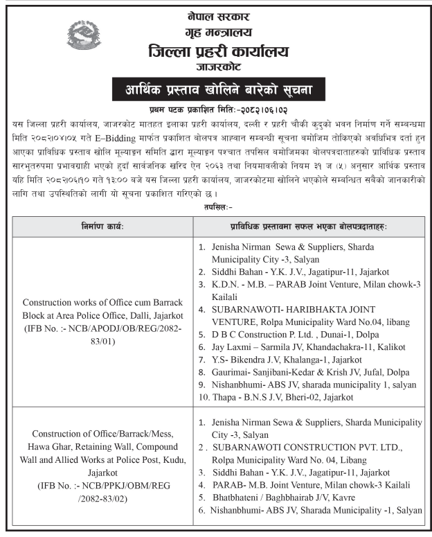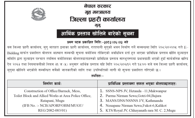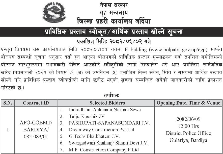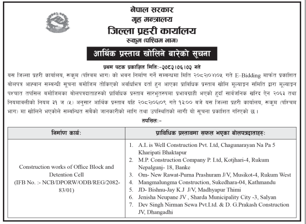 | 84 | Dullu Municipality Office | Badalamji Healpost Birthing Centre Construction works Dullu 8,Dailekh | 17/09/2025 | PPMO | 17/10/2025 | Click Here | |