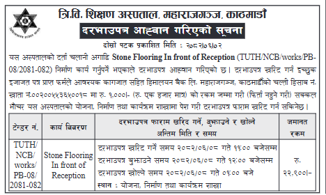 | 38 | Shahid Gangalal National Heart Centre | Kendra Hatavitra Chamenagrihya (Canteen) Sanchalan Karya Ko Lagi Awhon Gariyako Silbandi Darvaupatra | 17/09/2025 | PPMO | 05/10/2025 | Click Here | |
