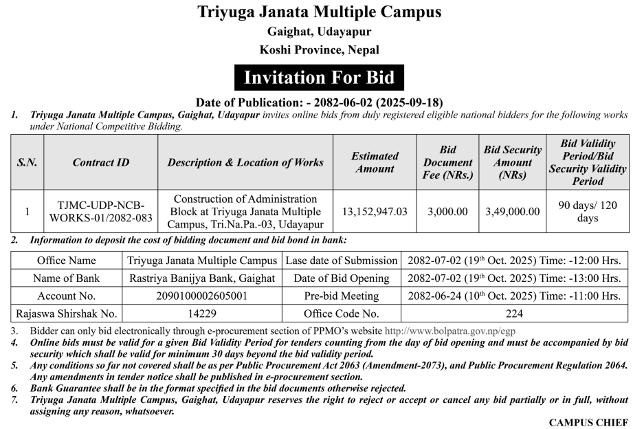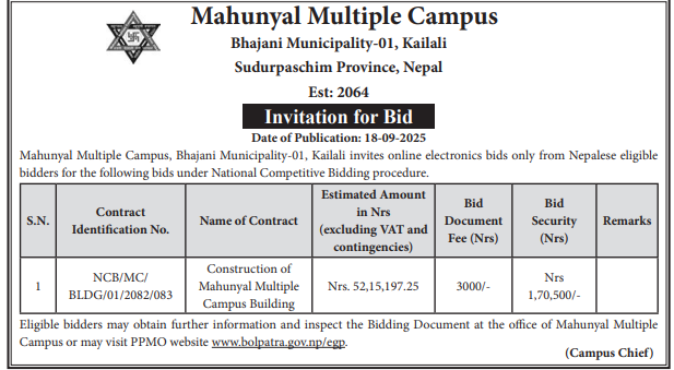 | 46 | Tikapur Multiple Campus | Renovation and Maintenance of Library Building (Block B) and Academic Building (Block-C).at Tikapur Multiple Campus, Tikapur, Kailali | 17/09/2025 | PPMO | 17/10/2025 | Click Here | |