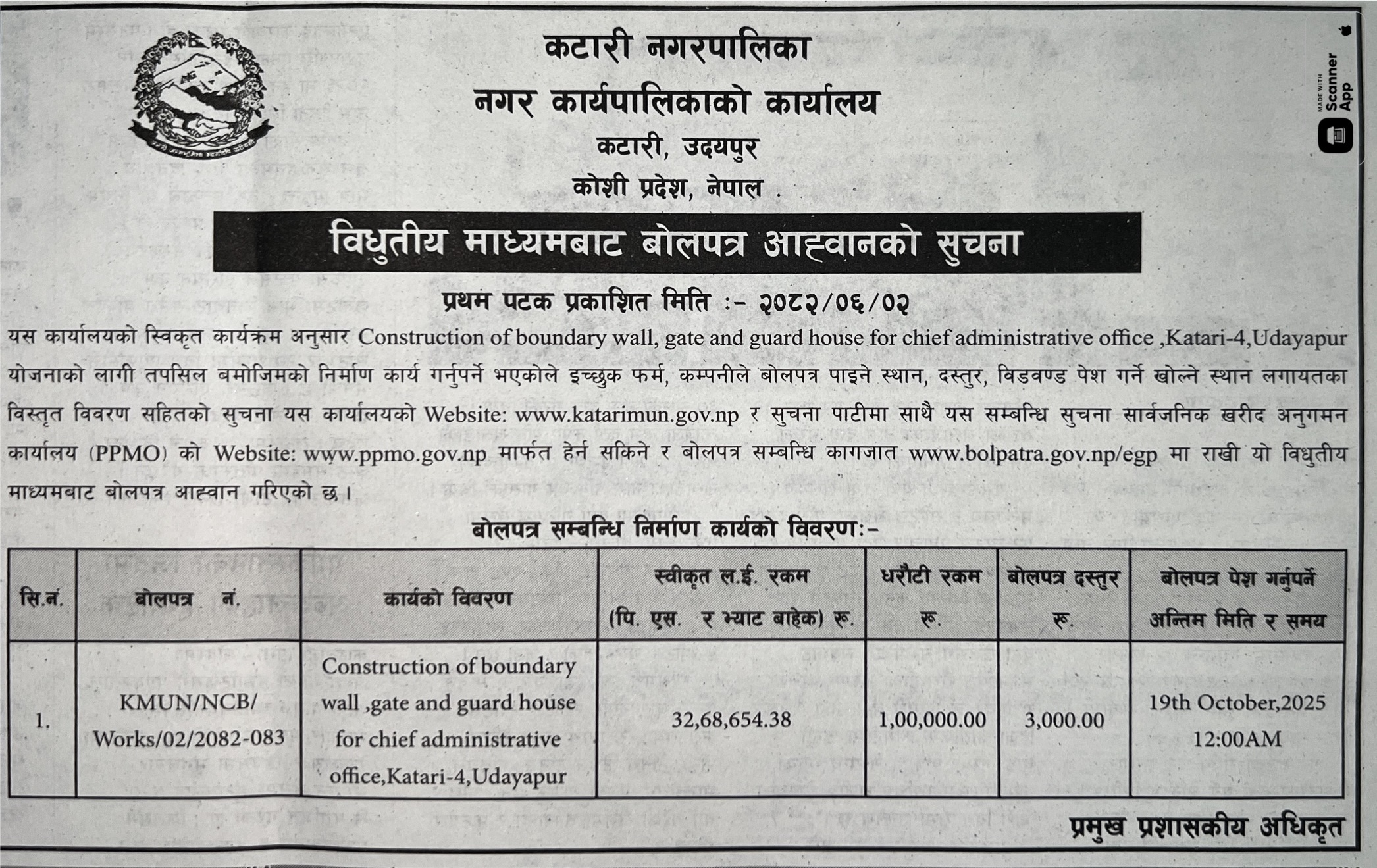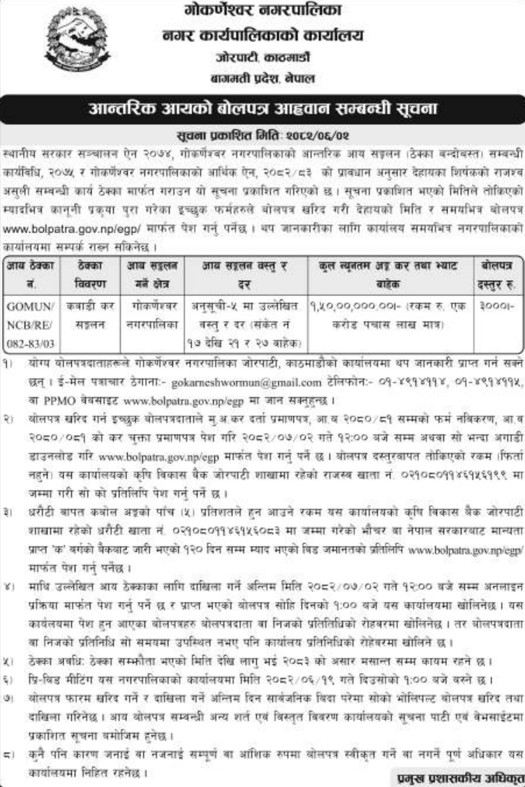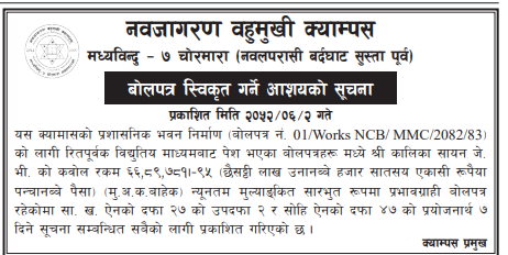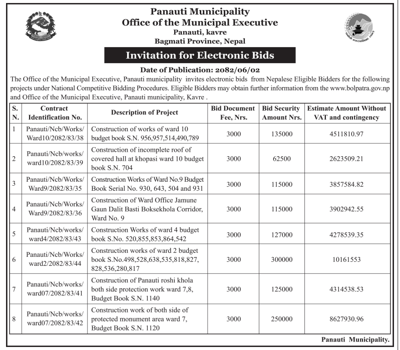 | 3 | Devchuli Municipality, Nawalparasi-East | Procurement of collection of scrap export tax in Devchuli Municipality For F/Y 2082/83(3rd time) | 17/09/2025 | PPMO | 24/09/2025 | Click Here | |