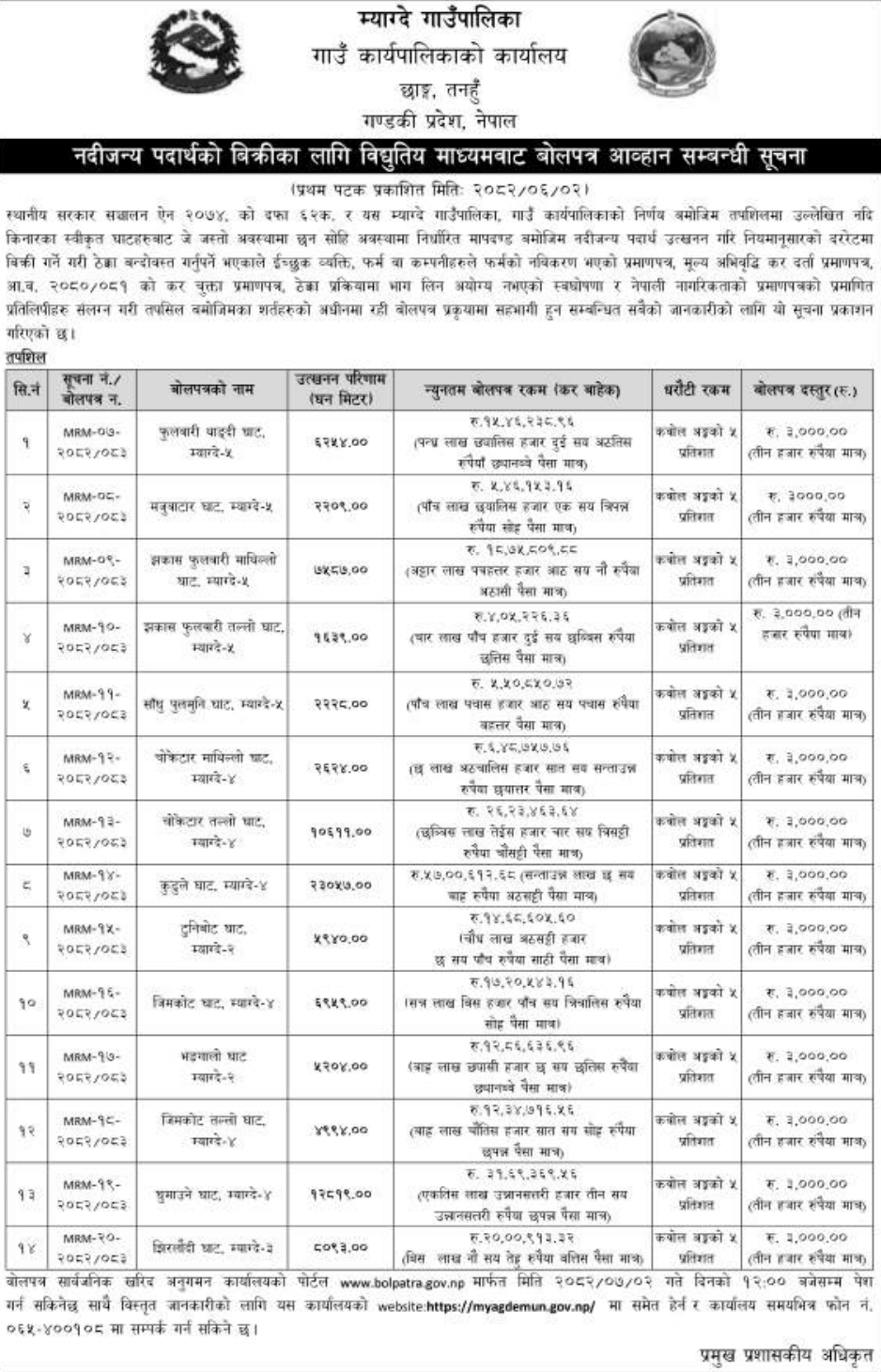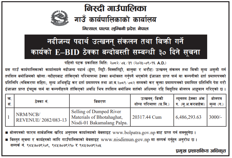 | 2 | Mangsebung Rural Municipality,Ilam | Collection and Extraction of Natural River Bed Materials (Sand, Stone, Gravel, Aggregate etc.) from different Ghat of Deumai Khola in Mangsebung Rural Municipality (For Internal Revenue Collection) | 17/09/2025 | PPMO | 05/10/2025 | Click Here | |