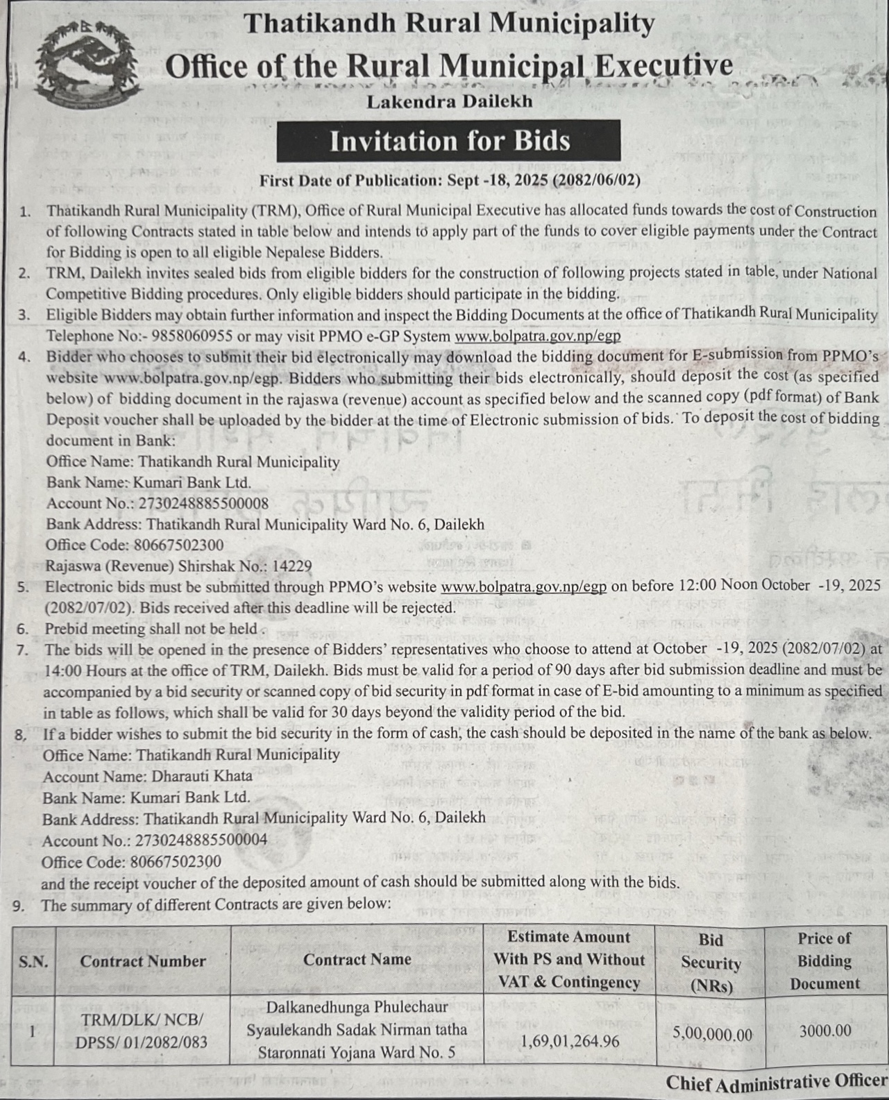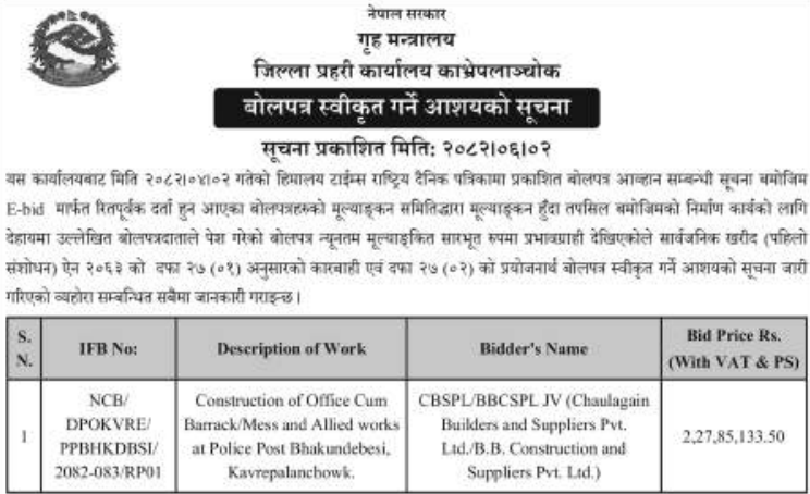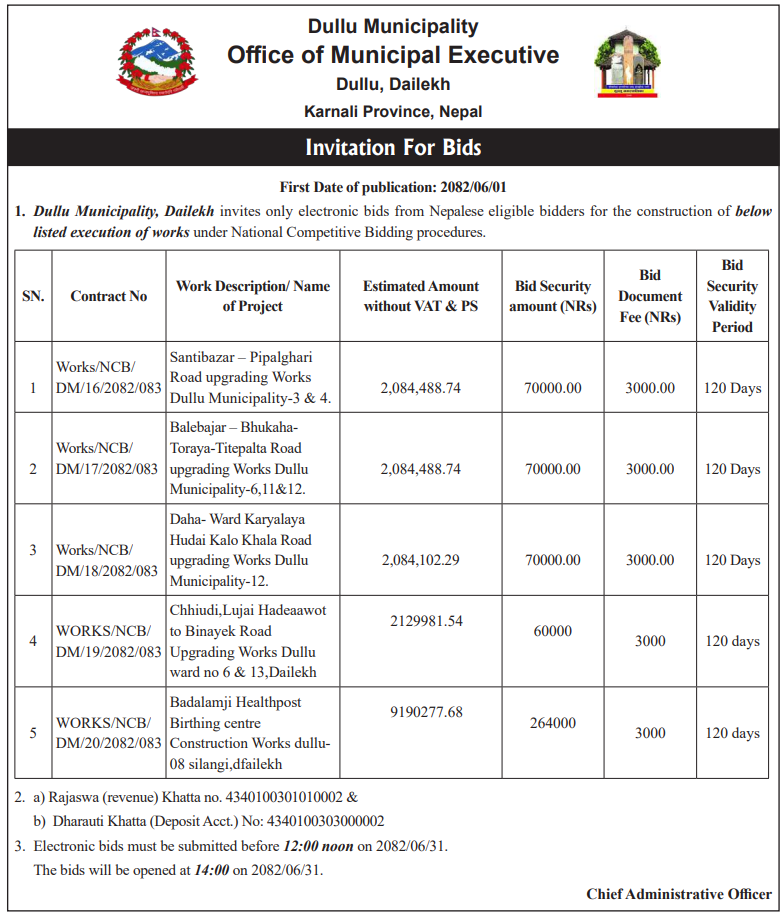 | 83 | Dullu Municipality Office | Chhiudi Lujai Hadeaawot To Binayek Road Upgrading Works | 17/09/2025 | PPMO | 17/10/2025 | Click Here | |