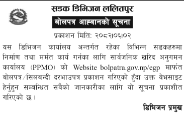 | 52 | 302 Division Road Office Pokhara | Upgrading of Samibagar-Tinghare Gaupalika Bhawan Jodne Motorbatochowk Main Road, Setighatta Siding Kalimati Road Machhapuchhre 4,9 Kaski | 17/09/2025 | PPMO | 17/10/2025 | Click Here | |