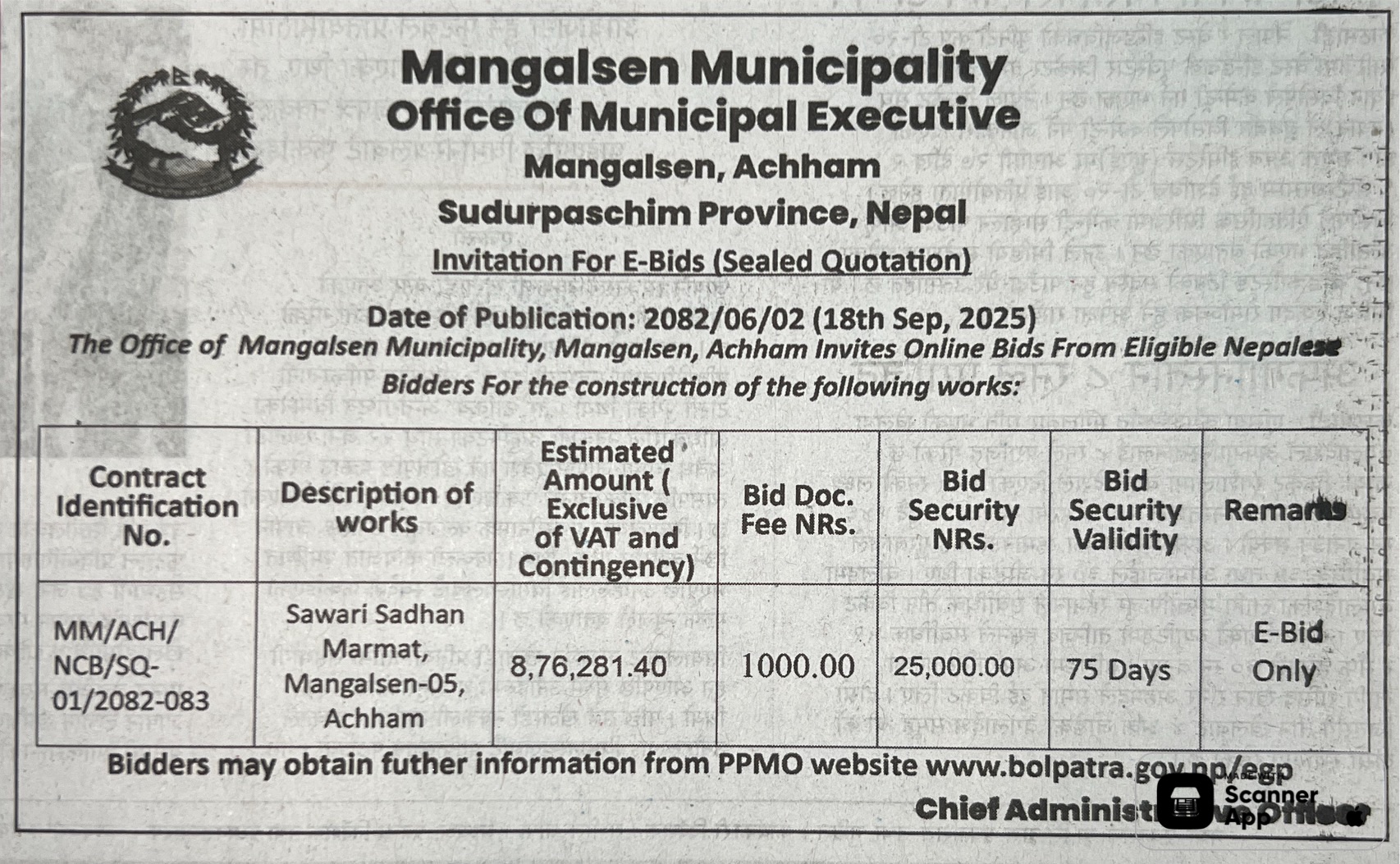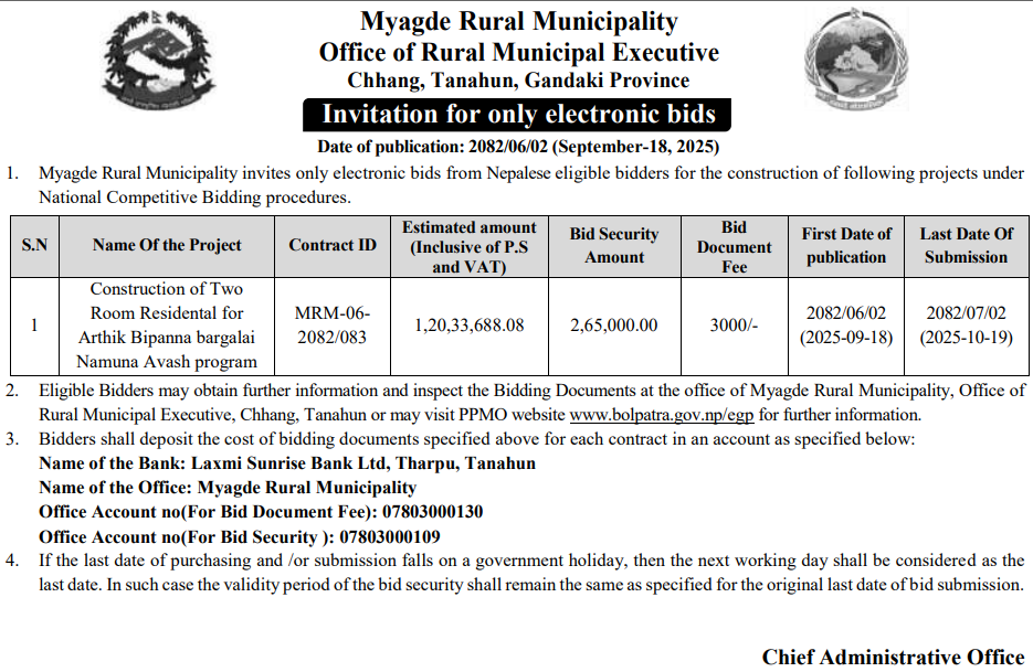 | 45 | Besisahar Municipality | Construction of Ward Office Building, Ward No.10 | 17/09/2025 | PPMO | 17/10/2025 | Click Here | |