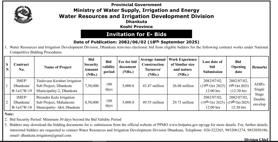 निर्माण सम्बन्धी प्रकाशित सम्पूर्ण ठेक्का टेन्डर तथा बोलपत्र सुचनाहरु प्रदेश अनुसार 18/09/2025 (Thursday)