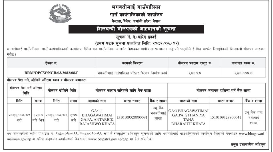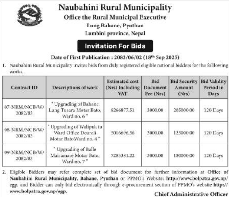 | 69 | Sunchhahari Rural Municipality, Pobang Rolpa | Pobang Dhaara Palika Khelmaidan Gramin Krishi Sadak Punasthapana Yojana | 17/09/2025 | PPMO | 17/10/2025 | Click Here | |