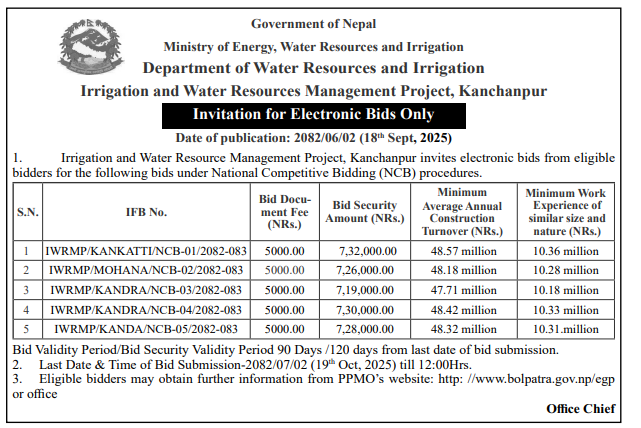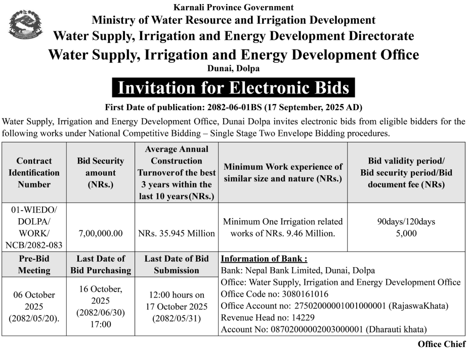 | 42 | Water Supply, Irrigation & Energy Development Office, Dunai | Construction works for Gumbatara Samuhik Khanepani tatha Sinchai Ayojana Kaike Ga.pa-3-Dolpa, Khubukhola Dekhi Tupatara Syau Faram Samma Sinchai Nirman, Kaike Ga.Pa.-4 Dolpa, Tongna Sinchai Yojana Nirman Kaike 3 Dolpa, Finga Samudayak Krishi Kheti Sinchai Kaike 1 Dolpa, Silung Dekhi Rungpuni Samma Sinchai Yojana Kaike Ga.Pa.-2, Dolpa, Elakot Chadama Tatbandhan Ayojana Kaike Ga.Pa. 3 Dolpa, Chhowa Khursani Sinchai Nirman Kaike Ga.Pa.-5 Dolpa and Era Sinchai Nirman Yojana, Kaike Ga.Pa.-6 Dolpa | 17/09/2025 | PPMO | 17/10/2025 | Click Here | |