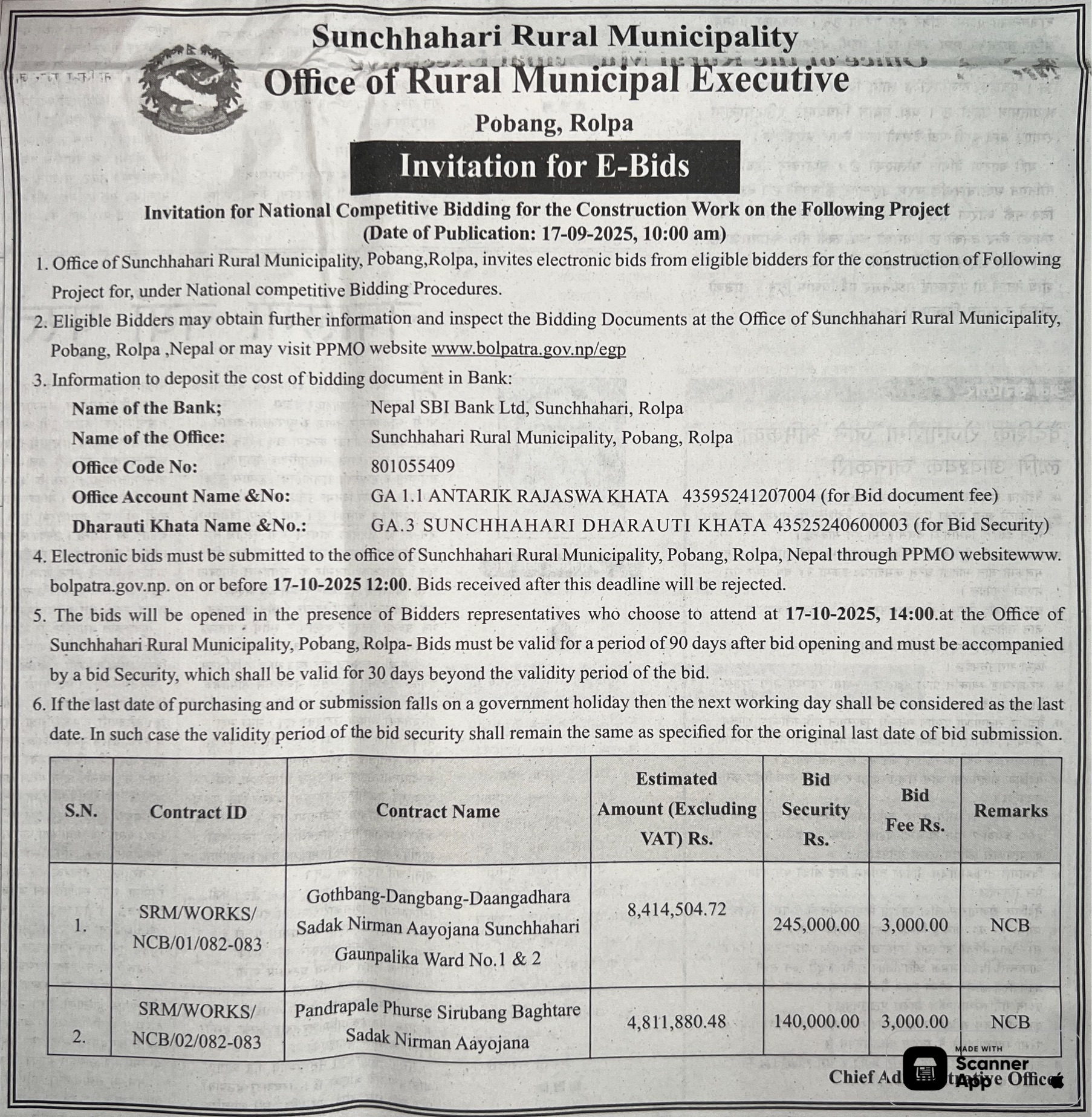 | 67 | Sunchhahari Rural Municipality, Pobang Rolpa | Pandrapale Phurse Sirubang Baghtare Sadak Nirman Aayojana | 17/09/2025 | PPMO | 17/10/2025 | Click Here | |