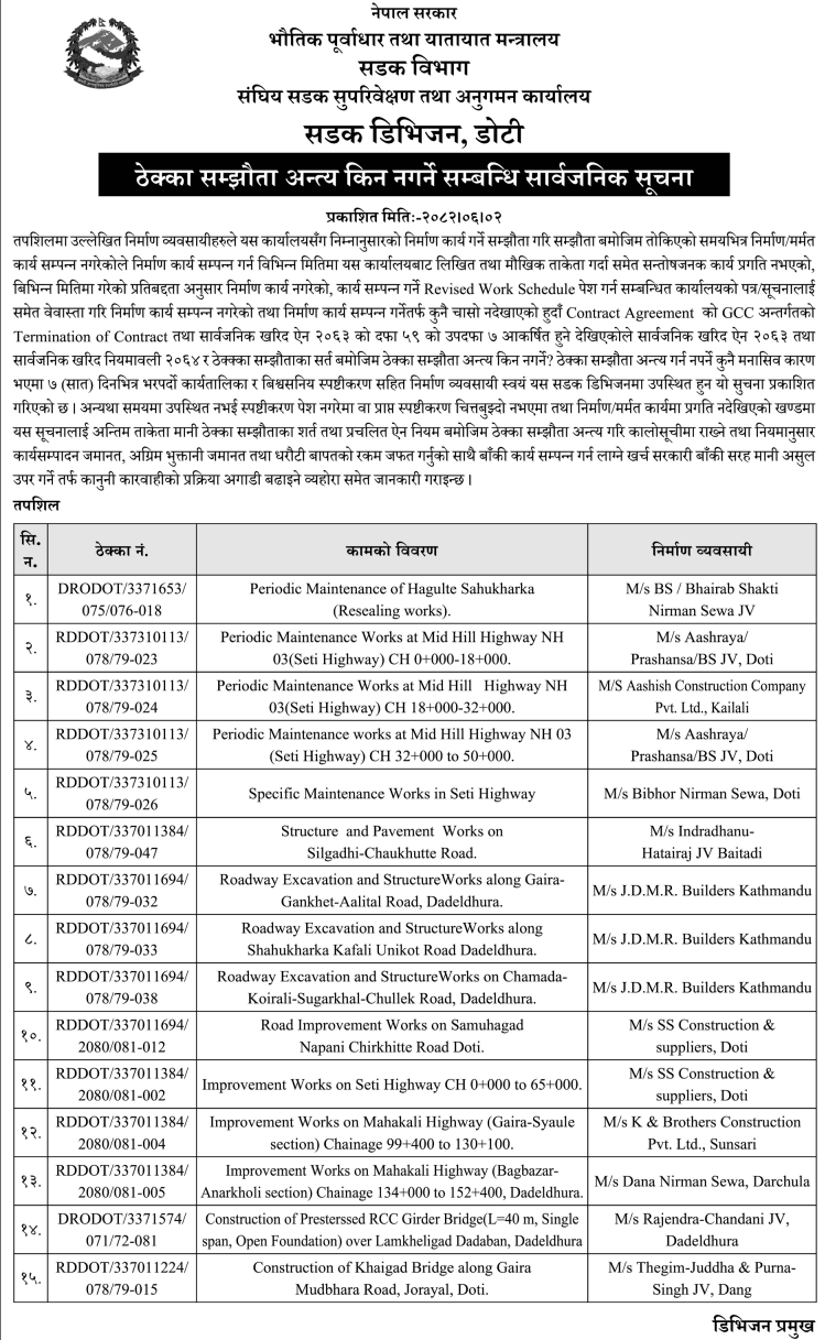 | 54 | 302 Division Road Office Pokhara | Retaining wall, Side & X-drainage structure, Rigid Pavement and Blacktop Works on Bhustung Dekhi Rudrabeni Sadak, Syangja | 17/09/2025 | PPMO | 17/10/2025 | Click Here | |