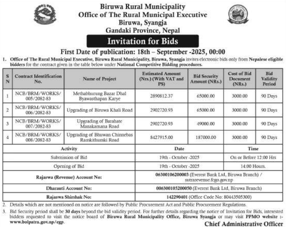 | 55 | 302 Division Road Office Pokhara | Roadway Excavation,Retaining wall, Side & X-drainage structure Works on Rudrabeni - Alamdevi deureli - Ranimahal sadak,Syangja | 17/09/2025 | PPMO | 17/10/2025 | Click Here | |