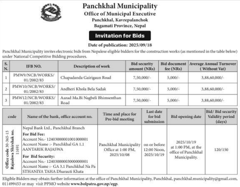 | 64 | Jiri Municipality, Dolakha | Upgrading of pumpagau road at jiri-1 | 17/09/2025 | PPMO | 17/10/2025 | Click Here | |