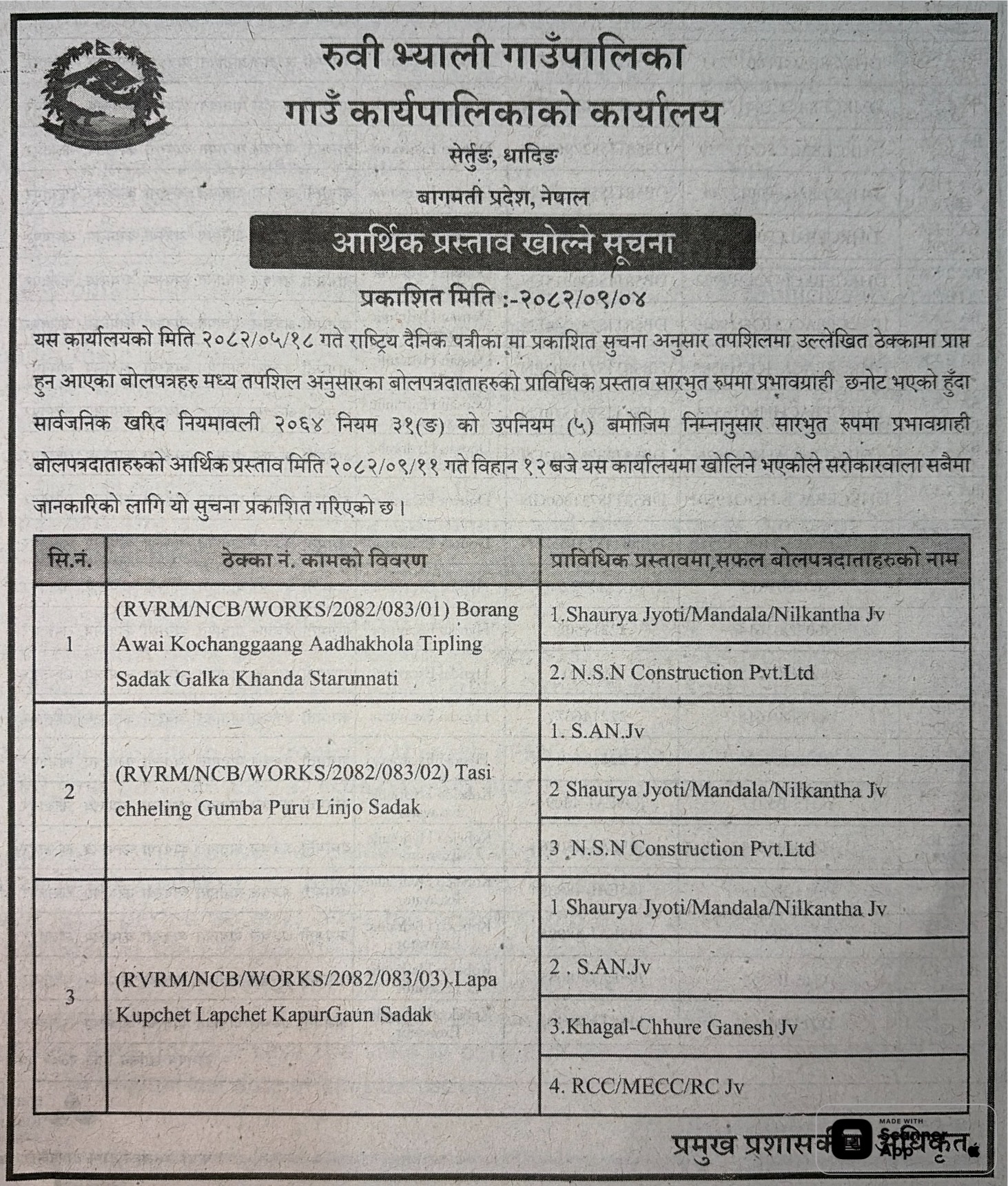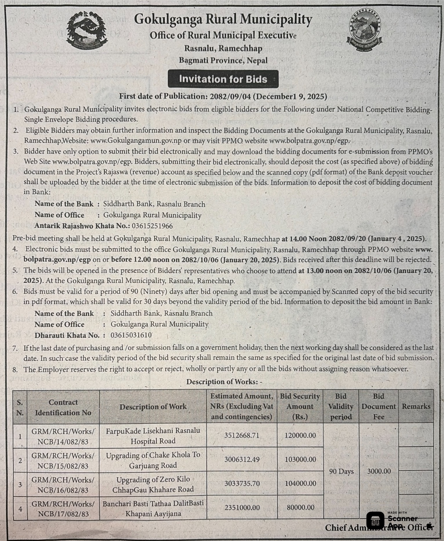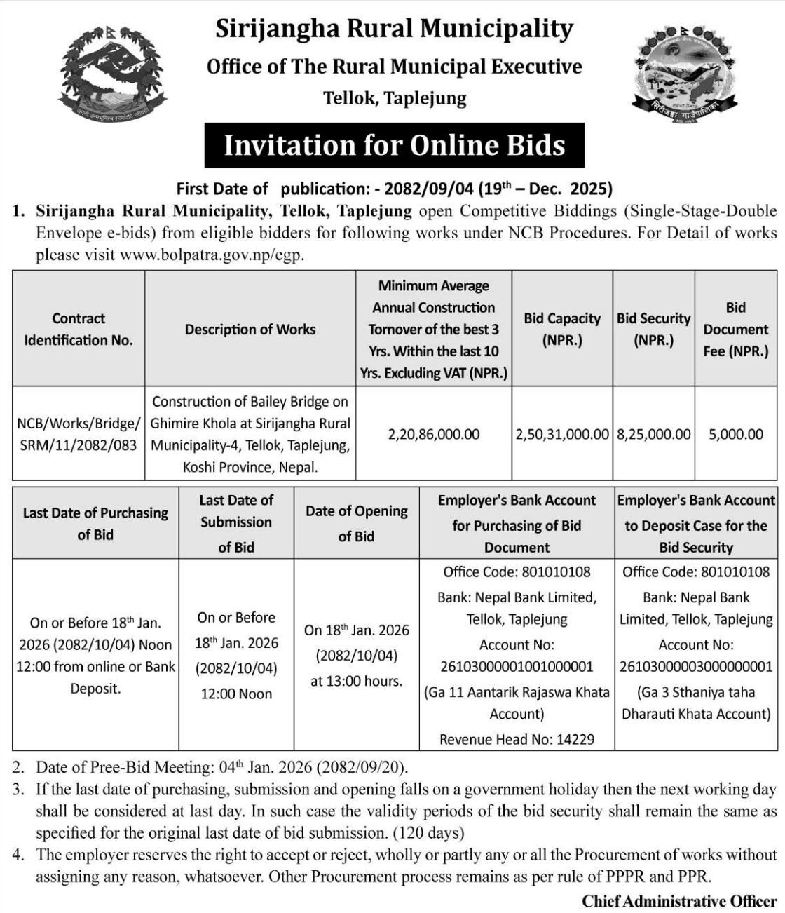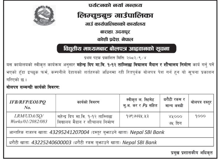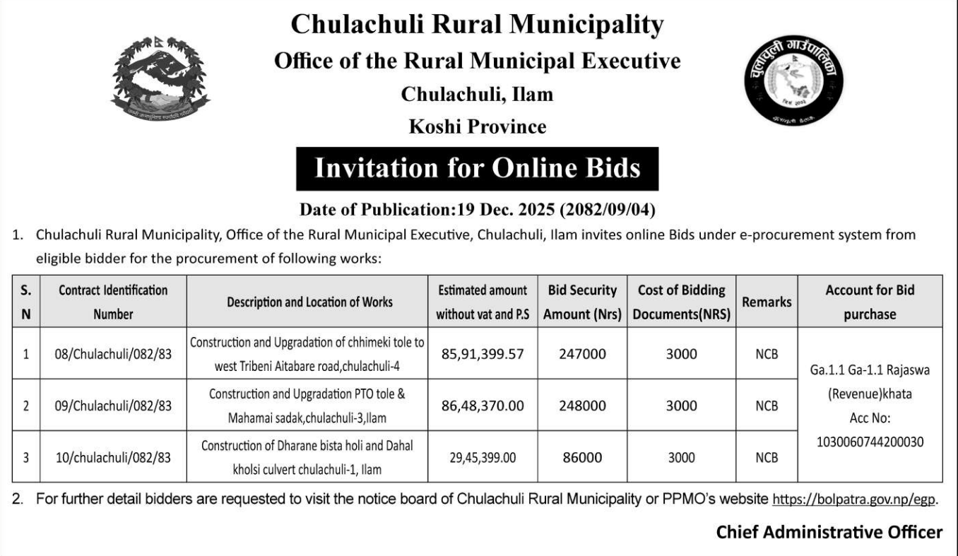 | 199 | Gaumukhi Rural Municipality Office, Lumbini Province, PYUTHAN; | Construction of Jharbangkhola Kudra Thulachaur Baismul Sadak | 18/12/2025 | PPMO | 02/01/2026 | Click Here | |